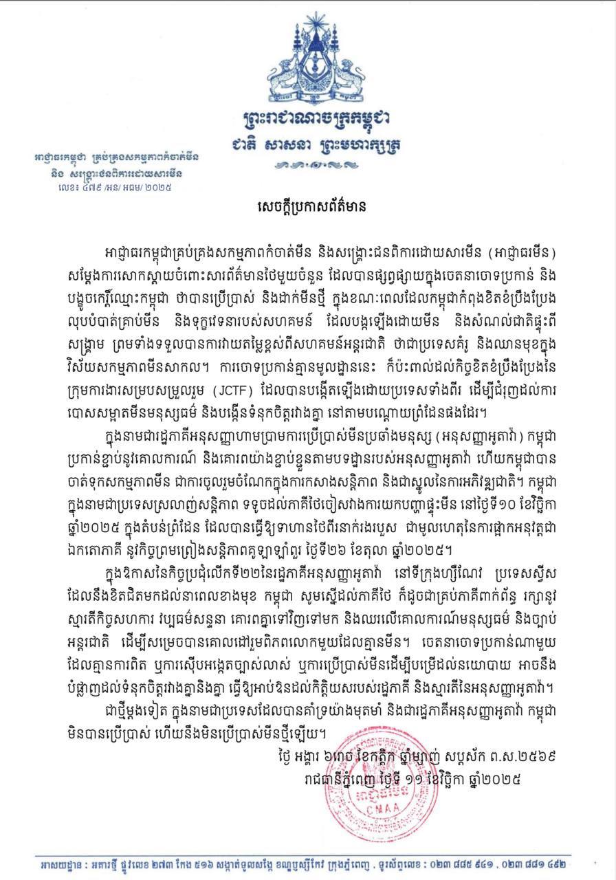 ភ្នំពេញៈ រាជរដ្ឋាភិបាលកម្ពុជាបានបង្ហាញការព្រួយបារម្ភយ៉ាងខ្លាំង ចំពោះសេចក្តីរាយការណ៍តាមប្រព័ន្ធផ្សព្វផ្សាយជាច្រើន ដកស្រង់សំដីរបស់ថ្នាក់ដឹកនាំថៃ ដែលបង្ហាញថា ថៃបានផ្អាកការអនុវត្តសេចក្តីថ្លែងការណ៍រួម រវាងនាយករដ្ឋមន្ត្រីកម្ពុជា-ថៃ ដែលត្រូវបានចុះហត្ថលេខា ដោយមានវត្តមានរបស់លោក ដូណាល់ ត្រាំ ប្រធានាធិបតីសហរដ្ឋអាមេរិក និងលោក អាន់វ៉ា អ៊ីប្រាហ៊ីម នាយករដ្ឋមន្ត្រីម៉ាឡេស៊ី និងជាប្រធានអាស៊ាន ធ្វើជាសាក្សី នៅទីក្រុងគូឡាឡាំពួ ប្រទេសម៉ាឡេស៊ី នាថ្ងៃទី២៦ ខែតុលា ឆ្នាំ២០២៥។