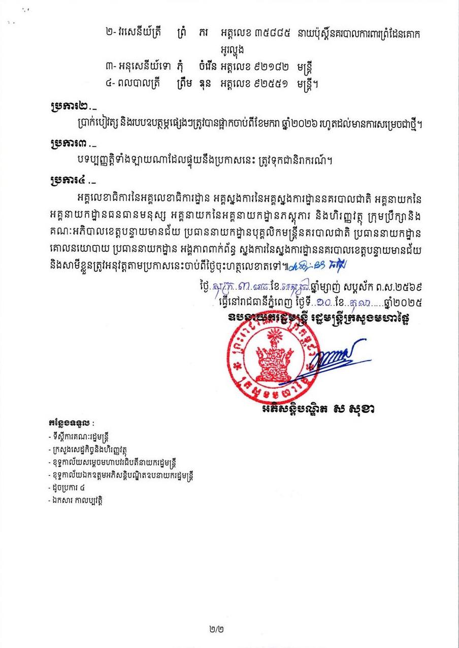 ភ្នំពេញៈ ក្រសួងមហាផ្ទៃ ផ្អាកការងារ ដោយផ្អាកប្រាក់បៀវត្ស បណ្តោះអាសន្នចំពោះមន្ត្រីនគរបាល ចំនួន ៤រូប នៃស្នងការដ្ឋាននគរបាលខេត្តបន្ទាយមានជ័យ ចំណុះអគ្គស្នងការដ្ឋាននគរបាលជាតិ ដើម្បីបើកផ្លូវឱ្យតុលាការ បន្តនីតិវិធីតាមផ្លូវច្បាប់!