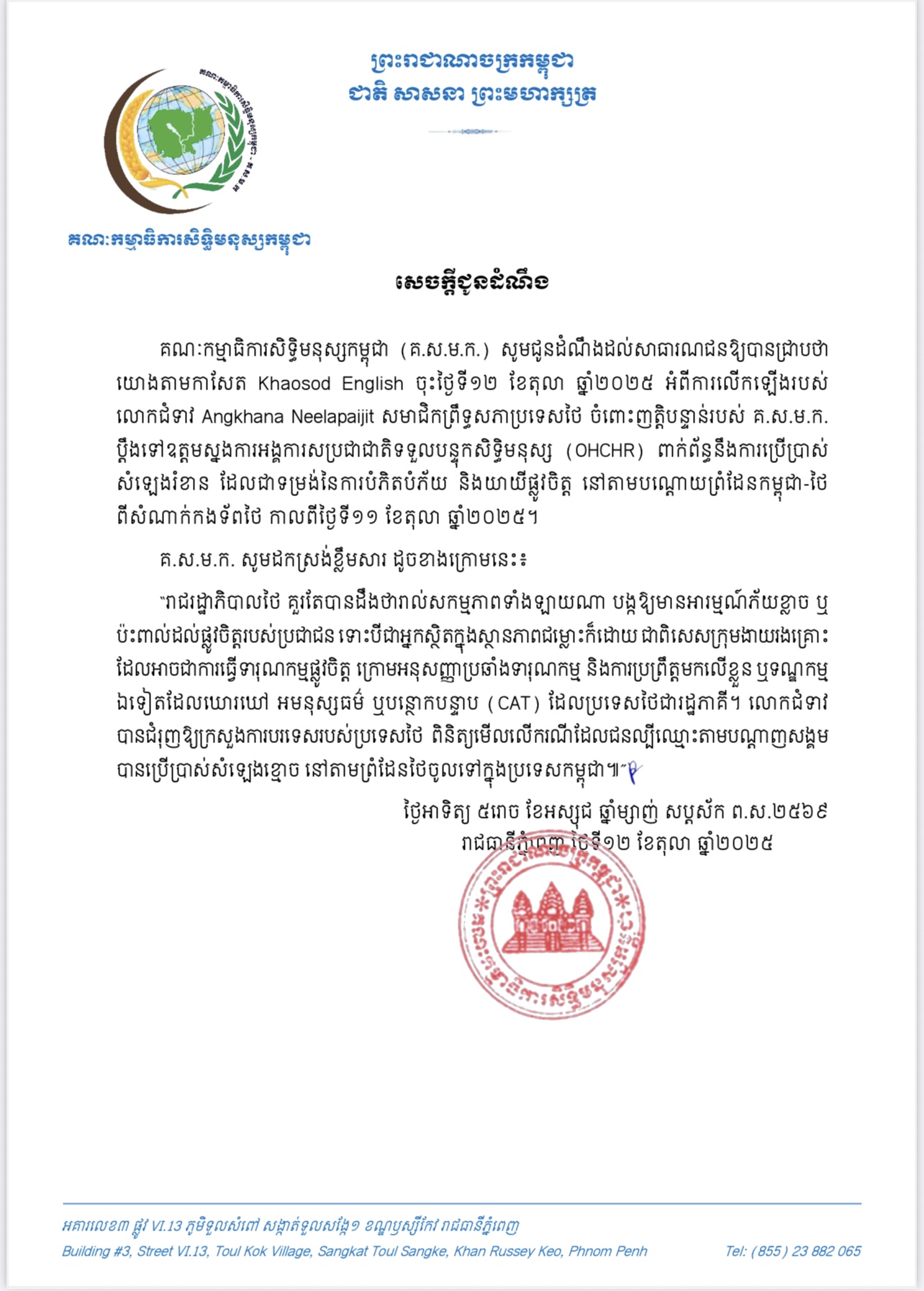 ភ្នំពេញៈ សមាជិកព្រឹទ្ធសភាប្រទេសថៃ អំពាវនាវឱ្យរាជរដ្ឋាភិបាលថៃ ពិនិត្យ និងអន្ដរាគមន៍ករណីដែលជនល្បីឈ្មោះតាមបណ្ដាញសង្គម បានប្រើប្រាស់សំឡេងខ្មោច ដែលជាទម្រង់នៃការបំភិតបំភ័យ និងយាយីផ្លូវចិត្ត នៅតាមបណ្ដោយព្រំដែនកម្ពុជា-ថៃ ពីសំណាក់កងទ័ពថៃ កាលពីថ្ងៃទី១១ ខែតុលា ឆ្នាំ២០២៥។