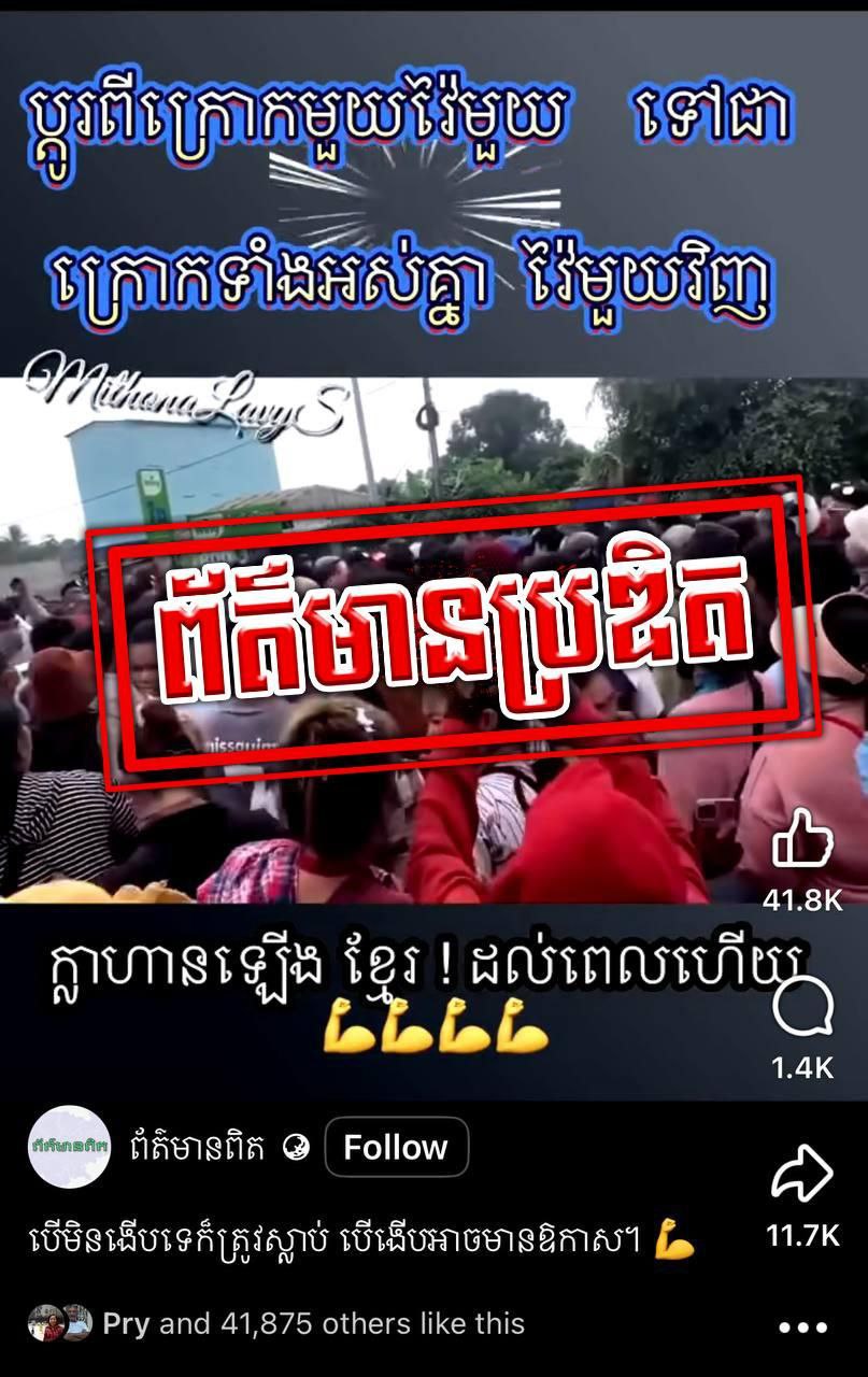 បើតាមលោក ស៊ុន មេសា ម្ចាស់ហ្វេសប៊ុកផេក ព័ត៌មានពិត កំពុងយករូបភាពសកម្មភាពកម្មករទៅកាត់តច្នៃប្រឌិតក្នុងចេតនាញុះញង់ប្រជាពលរដ្ឋតាមរយៈបណ្តាញសង្គមឱ្យងើបឡើងបះបោរ ផ្តួលរំលំរាជរដ្ឋាភិបាលស្របច្បាប់ និងកៀរគរប្រជាពលរដ្ឋឱ្យធ្វើសកម្មភាពផ្សេងៗផ្ទុយនឹងច្បាប់។ លោកបន្តថា នេះជារឿងអគុណធម៌បំផុត ដែលម្ចាស់ហ្វេសប៊ុកផេកមួយនេះខំប្រឹងមួលបង្កាច់ លាបពណ៌ ទម្លាក់កំហុសគ្រប់បែបយ៉ាងមកលើរាជរដ្ឋាភិបាល៕