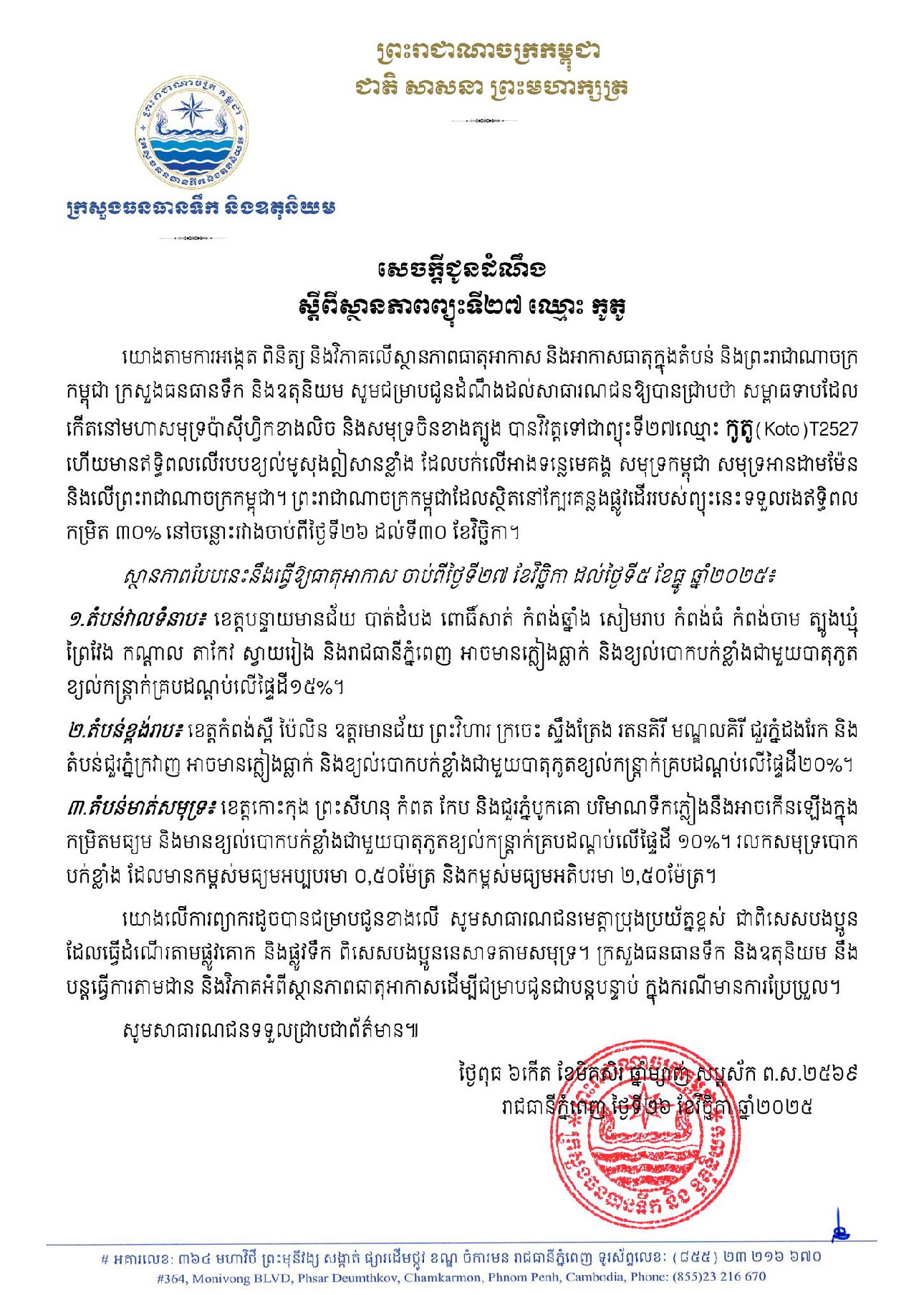 យោងតាមការអង្កេត ពិនិត្យ និងវិភាគលើស្ថានភាពធាតុអាកាស និងអាកាសធាតុក្នុងតំបន់ ព្រះរាជាណាចក្រ កម្ពុជា ក្រសួងធនធានទឹក និងឧតុនិយម បានបញ្ជាក់ថា សម្ពាធទាបដែល កើតនៅមហាសមុទ្រប៉ាស៊ីហ្វិកខាងលិច និងសមុទ្រចិនខាងត្បូង បានវិវត្តទៅជាព្យុះទី២៧ឈ្មោះ កូតូ (Koto) T2527 ហើយមានឥទ្ធិពលលើរបបខ្យល់មូសុងឦសានខ្លាំង ដែលបក់លើអាងទន្លេមេគង្គ សមុទ្រកម្ពុជា សមុទ្រអានដាមម៉ែន និងលើព្រះរាជាណាចក្រកម្ពុជា។ ព្រះរាជាណាចក្រកម្ពុជាដែលស្ថិតនៅក្បែរគន្លងផ្លូវដើររបស់ព្យុះនេះទទួលរងឥទ្ធិពល កម្រិត ៣០% នៅចន្លោះរវាងចាប់ពីថ្ងៃទី២៦ ដល់ទី៣០ ខែវិច្ឆិកា។