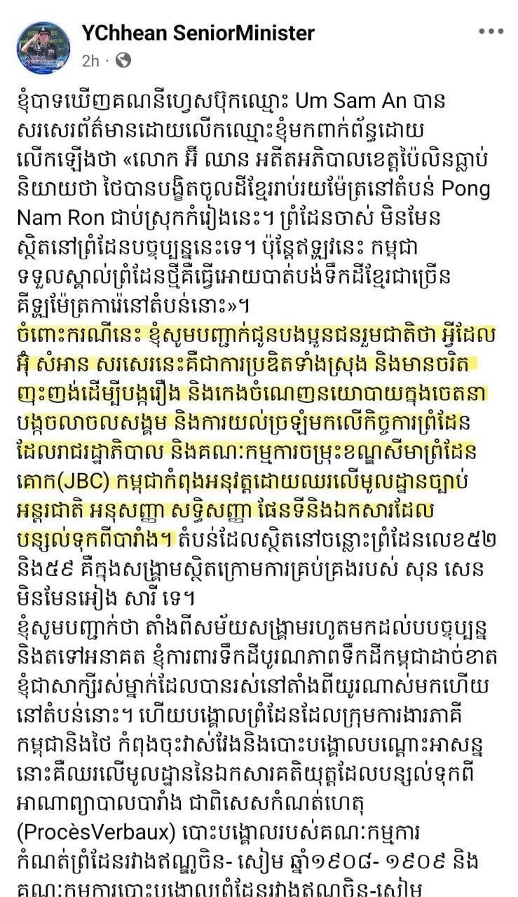 ក្នុងកាលៈទេសៈដែលយើងកំពុងដោះស្រាយបញ្ហាព្រំដែនជាមួយប្រទេសជិតខាង សម្ដេចធិបតីមិនចង់មានការឆ្លើយឆ្លងជាមួយអ្នកនយោបាយខ្មែរមួយចំនួននោះទេ។ ក៏ប៉ុន្តែពេលខ្លះក៏មានការចាំបាច់ក្នុងការលើកឡើងនូវចំណុចមួយចំនួន កុំឱ្យក្រុមអ្នកនយោបាយខ្លះឆ្លៀតប្រឌិតរឿងមិនពិតក្នុងចេតនាកេងចំណេញនយោបាយ និងដើម្បីឱ្យប្រជាពលរដ្ឋមានការយល់ច្រឡំមកលើរាជរដ្ឋាភិបាល។ សម្ដេចធិបតីបានបញ្ជាក់ថា កាលពីព្រឹកមិញនេះ លោក អ៊ុំ សំអាន បានបង្ហោះសារនៅក្នុងគណនីហ្វេសប៊ុករបស់ខ្លួនថា÷ Pong Nam Ron នេះជាប់ស្រុកកំរៀង ខេត្តបាត់ដំបងដែលជាអតីតតំបន់មូលដ្ឋានយោធាខ្មែរក្រហមដែលលោក អៀង សារី បានកាន់កាប់ហើយមានលោក អ៉ី ឈាន ជាមេទ័ព នាសម័យសង្រ្គាមសុីវិលនាទសវត្សទី៨០។