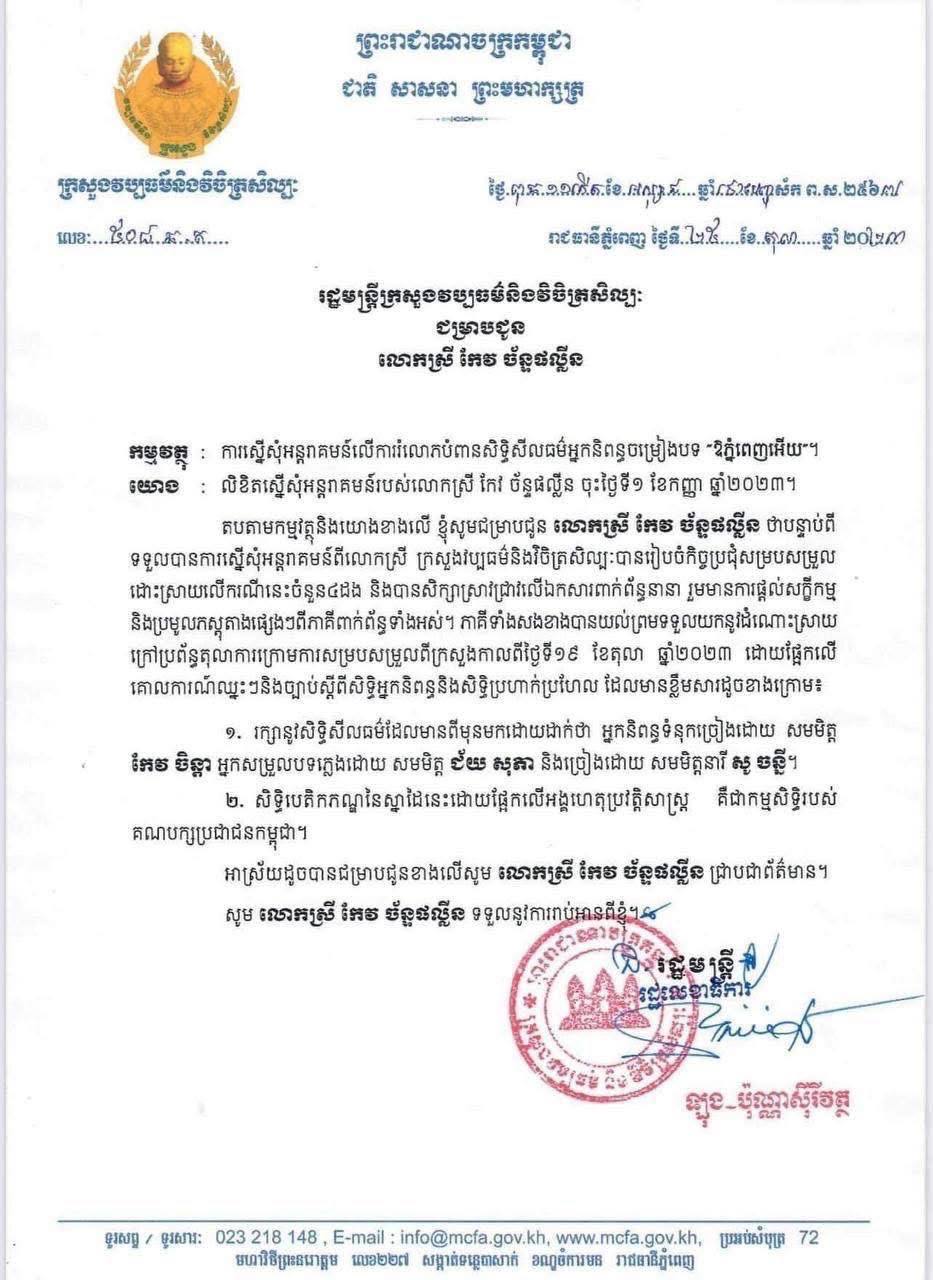 ទឹកដៃនិពន្ធទំនុកច្រៀងដោយបងកែវ ចិន្តា និងការរៀបចំភ្លេង និងដឹកនាំផលិតដោយបង ជ័យ សោភា និងច្រៀងដោយក្មួយ សូ ចន្នី ពិតជាគួរឲ្យគោរព និងកោតសរសើរ។ សម្ដេចតេជោសូមយកឱកាសនេះ សូមអភ័យទោសពីវិញ្ញាណក្ខន្ធបង កែវ ចិន្តា បង ជ័យ សោភា ក៏ដូចកូនៗ និងចៅរបស់បងទាំងពីរ ដែលមុននេះខ្ញុំយល់ច្រឡំថាគ្រួសារបង កែវ ចិន្តា និងគ្រួសារបងជ័យ សោភា ដណ្តើមសិទ្ធិធ្វើជាម្ចាស់បទ(ឱភ្នំពេញអើយ)ប៉ុន្តែនៅពេលខ្ញុំឃើញការបង្ហោះតាម Facebook របស់ឈ្មោះ chun sothy ដែលនៅក្នុងនោះបានបញ្ជាក់ថាម្ចាស់ស្នាដៃបទ«ឱភ្នំពេញអើយ» គឺលោកអ៊ុំ <ម៉ម ធឿន>…..បានទទួលមរណភាពហើយ។