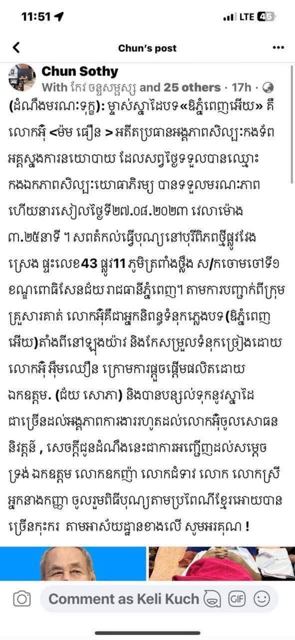 ប្រហែលអ្នកផ្សាយព័ត៌មានខុសដោយអចេតនា ដែលថាលោក ម៉ម ធឿន ជាម្ចាស់បទចម្រៀង(ឱ ភ្នំពេញអើយ) ខ្ញុំជាអ្នកគ្រប់គ្រងលើឪពុករបស់ក្មួយៗ និងចៅៗ យើងជាយោធាមិនអាចយកចម្រៀងទៅថតនៅអង្គភាពស៊ីវិលបានទេ បើគ្មានការអនុញ្ញាតិពីខ្ញុំនាពេលនោះ។ សម្ដេចតេជោសូមលោក chun sothy ធ្វើការកែតម្រូវព័ត៌មាន ដែលបានផ្សាយខុស។ ការខិតខំស្រាវជ្រាវ និងពន្យល់របស់ខ្ញុំ គឺដើម្បីជៀសវាងការយល់ច្រឡំទៅថ្ងៃក្រោយព្រោះបទចម្រៀង (ឱភ្នំពេញអើយ) ជាបទចម្រៀងប្រវត្តិសាស្ត្រ៕