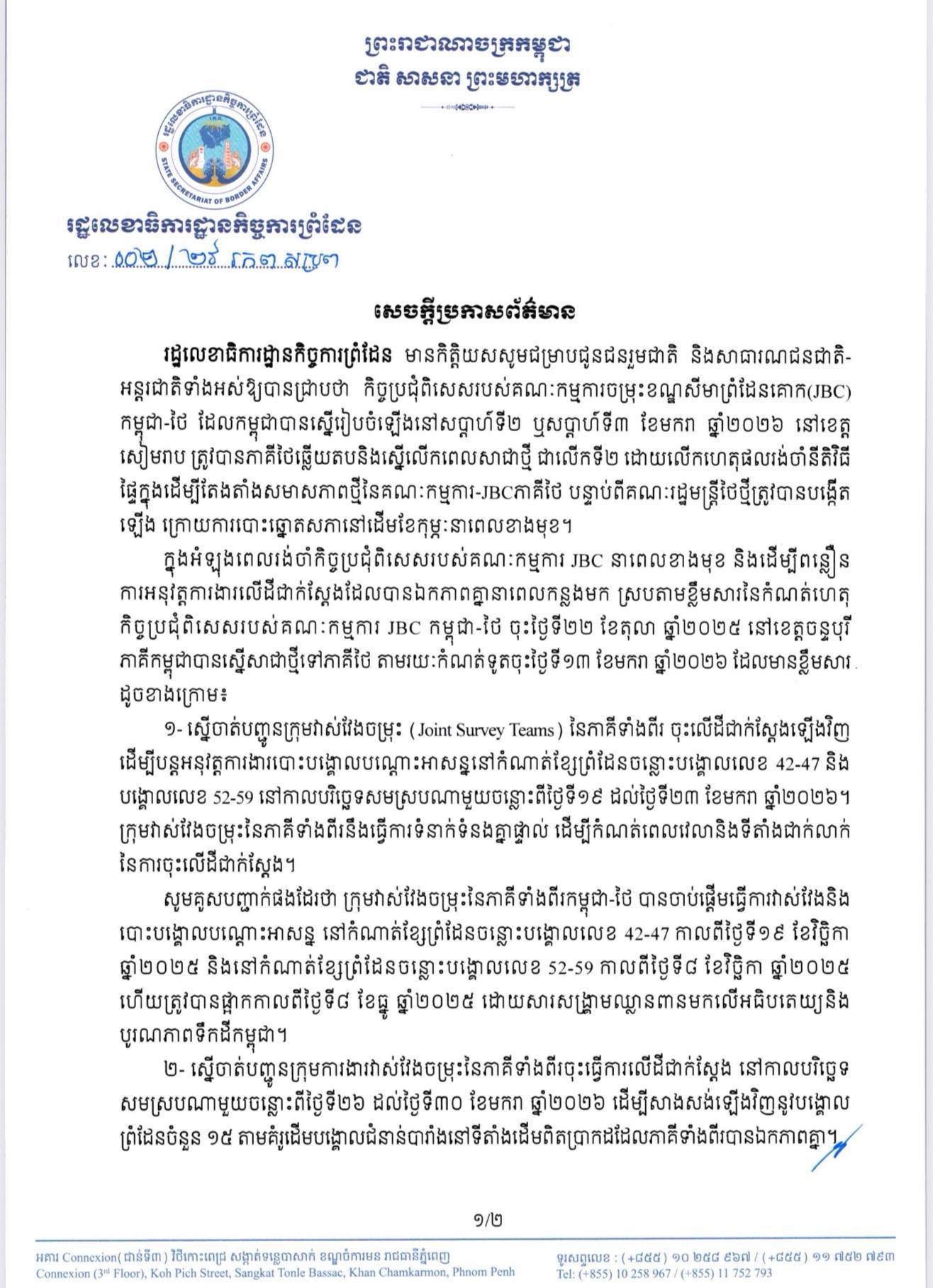 យោងតាមបណ្ដាញសង្គមផ្លូវការក្រុមប្រឹក្សាអភិវឌ្ឍន៍កម្ពុជា កាលពីរសៀលថ្ងៃទី១៤ ខែមករា ឆ្នាំ២០២៦ ថា លោក ស៊ុន ចាន់ថុល ឧបនាយករដ្ឋមន្ត្រី អនុប្រធានទី១ ក្រុមប្រឹក្សាអភិវឌ្ឍន៍កម្ពុជា បានអនុញ្ញាតជូនគណៈប្រតិភូដឹកនាំដោយ លោក Zhou Hong ប្រធានក្រុមប្រឹក្សាភិបាលនៃក្រុមហ៊ុន Fourth Construction Co., Ltd. (FCC) ដែលជាបុត្រសម្ព័ន្ធយុទ្ធសាស្ត្រ របស់ សហគ្រាសរដ្ឋ ខ្នាតធំចិន China National Chemical Engineering Group Corporation (CNCEC)ចូលជួបសម្ដែងការ គួរសមនិងពិភាក្សា ការងារលើកាលានុវត្តភាពវិនិយោគនៅកម្ពុជា។