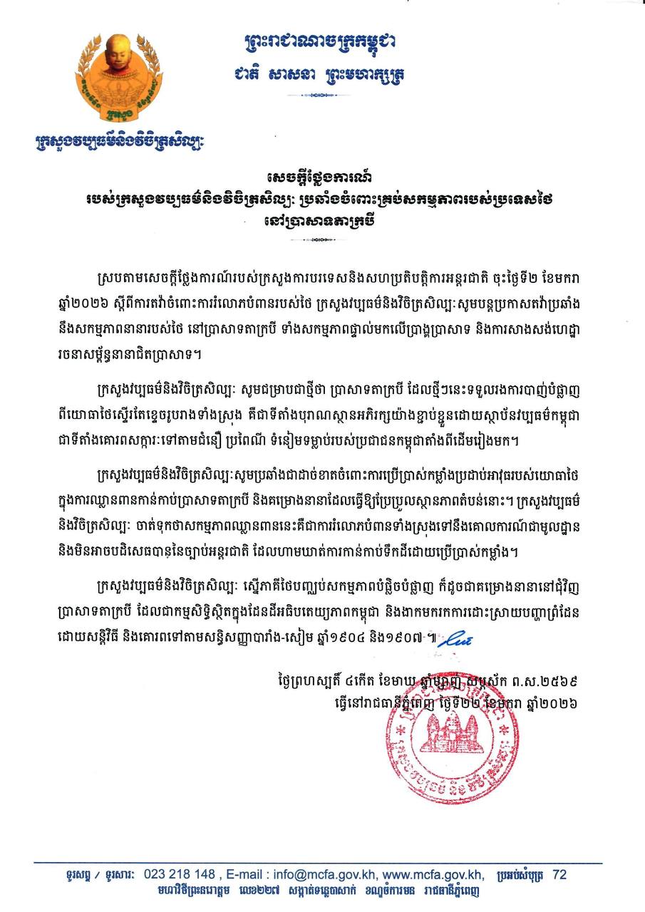 ក្រសួងវប្បធម៌ ប្រឆាំងសកម្មភាពនានារបស់ថៃមកលើប្រាសាទតាក្របី