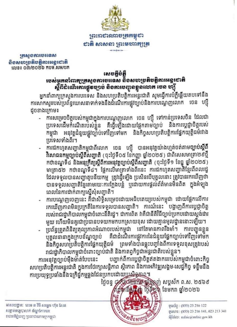 សេចក្តីបំភ្លឺដដែលបានបន្ថែមថា ការអនុវត្តច្បាប់ដ៏ម៉ឺងម៉ាត់បែបនេះ គឺជាសារបញ្ជាក់ពីការប្តេជ្ញាចិត្តរបស់កម្ពុជា ក្នុងការចូលរួមចំណែកថែរក្សាសន្តិភាព ស្ថិរភាព និងការប្រយុទ្ធប្រឆាំងនឹងឧក្រិដ្ឋកម្មឆ្លងដែនគ្រប់ទម្រង់ ដើម្បីលើកកម្ពស់ការអភិវឌ្ឍសង្គម-សេដ្ឋកិច្ច៕