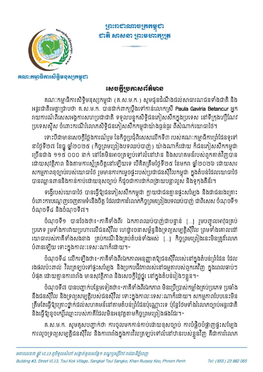 តាមរយៈសេចក្តីប្រកាសព័ត៌មានរបស់គណៈកម្មាធិការសិទ្ធិមនុស្សកម្ពុជាចេញផ្សាយនៅថ្ងៃទី២៦ ខែមករា ឆ្នាំ២០២៦បានឱ្យដឹងថា គិតត្រឹមថ្ងៃទី២៥ ខែមករា ឆ្នាំ២០២៦ មានជនភៀសសឹកកម្ពុជាជាង ១១៥,០០០ នាក់ នៅតែមិនអាចត្រឡប់ទៅផ្ទះសំបែងវិញបាន ។ ប្រភពដដែលបញ្ជាក់ថា យោធាថៃបានឈ្លានពាន និងកាន់កាប់តំបន់មួយចំនួនដោយខុសច្បាប់ រួមទាំងបានកម្ទេចផ្ទះសំបែងប្រជាជនស៊ីវិល និងដាក់ពង្រាយរបាំង បន្លាលួស និងទូកុងតឺន័ររារាំងផ្លូវ ។
