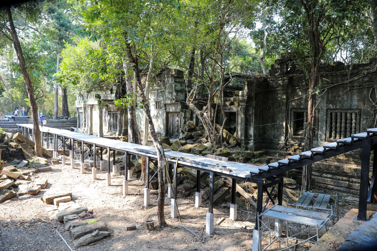 សៀមរាបៈ នាយកដ្ឋានអភិរក្សប្រាសាទ និងបុរាណវិទ្យានៃអាជ្ញាធរជាតិអប្សរា កំពុងដំណើរការជួសជុលស្ពានឈើនៅប្រាសាទបេងមាលា ដែលមានការពុកផុយ និងទ្រុឌទ្រោមខ្លាំង។