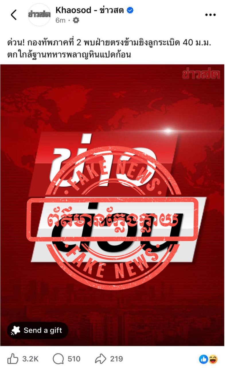 លោកស្រីឧត្តមសេនីយ៍ឯក ម៉ាលី សុជាតា អ្នកនាំពាក្យក្រសួងការពារជាតិ នៃព្រះរាជាណាចក្រកម្ពុជា បានឱ្យដឹងថា នៅថ្ងៃទី៥ ខែកុម្ភៈ ឆ្នាំ២០២៦នេះ មានបណ្តាញសារព័ត៌មានថៃមួយចំនួនបានផ្សព្វផ្សាយថា « បន្ទាន់! កងទ័ពភូមិភាគទី២ បានរកឃើញថា ភាគីម្ខាងទៀតបានបាញ់គ្រាប់បែក ៤០មីលីម៉ែត្រ ធ្លាក់នៅក្បែរមូលដ្ឋានទាហាន Phlan Hin Pet Kon។