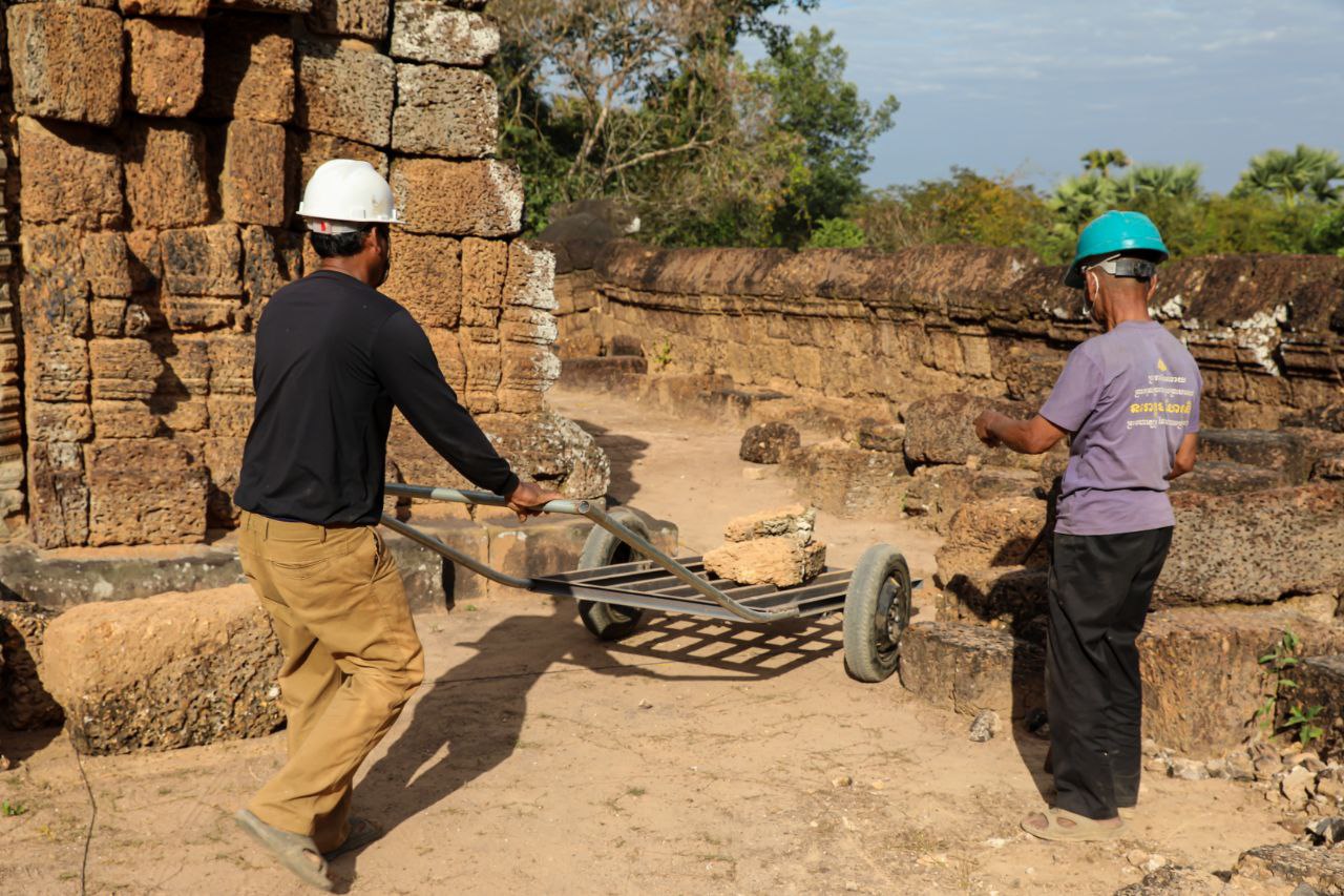 ក្នុងនោះ ក្រុមការងារផ្តោតសំខាន់ទៅលើការជួសជុលគ្រឹះ និងជញ្ជាំងថ្មបាយក្រៀម ដែលព័ទ្ធជុំវិញជារចនាសម្ពន្ធសម្រាប់ទ្រទ្រង់ដល់តួប៉មឥដ្ឋផ្នែកខាងលើ ដោយធ្វើការសម្អាតយកកំណកដីចេញពីតាមចន្លោះថ្នេរថ្ម និងកន្លែងប្រេះ រួចបិតបាយអឡើងវិញ ដើម្បីធានាមិនឱ្យទឹកជ្រាបចូល។