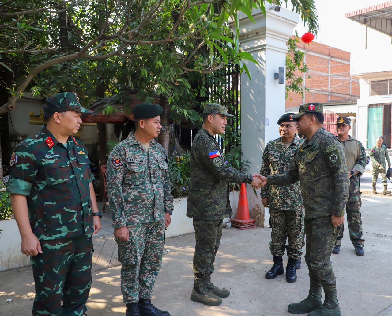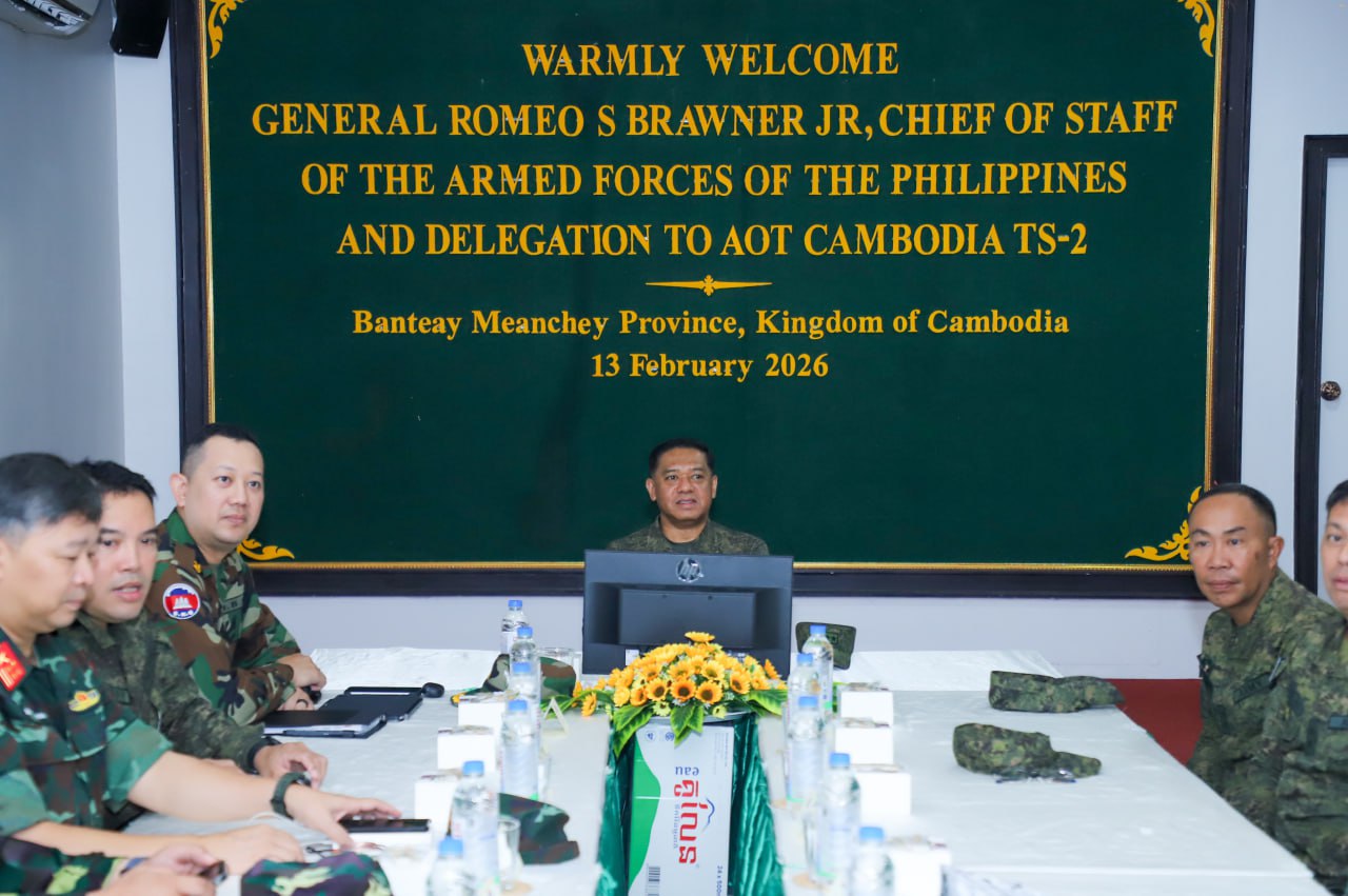 បន្ទាយមានជ័យៈ លោកស្រី ឧត្តមសេនីយ៍ឯក ម៉ាលី សុជាតា អ្នកនាំពាក្យក្រសួងការពារជាតិ នៃព្រះរាជាណាចក្រកម្ពុជា បានឱ្យដឹងថា នៅថ្ងៃសុក្រ ទី១៣ ខែកុម្ភៈ ឆ្នាំ២០២៦នេះ ក្រុមសម្របសម្រួល (CLG) នៃព្រះរាជាណាចក្រកម្ពុជា បានសម្របសម្រួលជូនដល់ក្រុមអ្នកសង្កេតការណ៍អាស៊ាន (AOT) ទទួលស្វាគមន៍ ឯកឧត្តម នាយឧត្តមសេនីយ៍ ROMEO S BRAWNER JR អគ្គមេបញ្ជាការ នៃកងទ័ពហ្វីលីពីន ដែលអញ្ជើញមកទស្សនកិច្ចទីតាំងមួយចំនួននៅក្នុងខេត្តបន្ទាយមានជ័យ។ គណៈប្រតិភូបានអញ្ជើញទៅទស្សនកិច្ចស្នាក់ការ២ ស្ថិតនៅក្រុងសិរីសោភ័ណ ដោយក្នុងឱកាសនោះ វរសេនីយ៍ឯក MOHD FARID BIN MOHD YUSOP ប្រធានក្រុមអ្នកសង្កេតការណ៍អាស៊ាន (AOT) ប្រចាំកម្ពុជាក៏បានធ្វើបទបង្ហាញជូនឯកឧត្តម អគ្គមេបញ្ជាការ និងគណៈប្រតិភូ ស្តីពីវឌ្ឍនភាពការងាររបស់ខ្លួនផងដែរ។