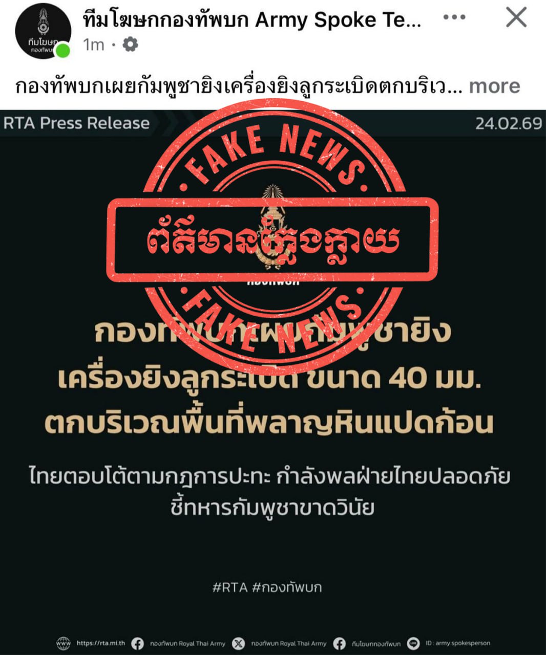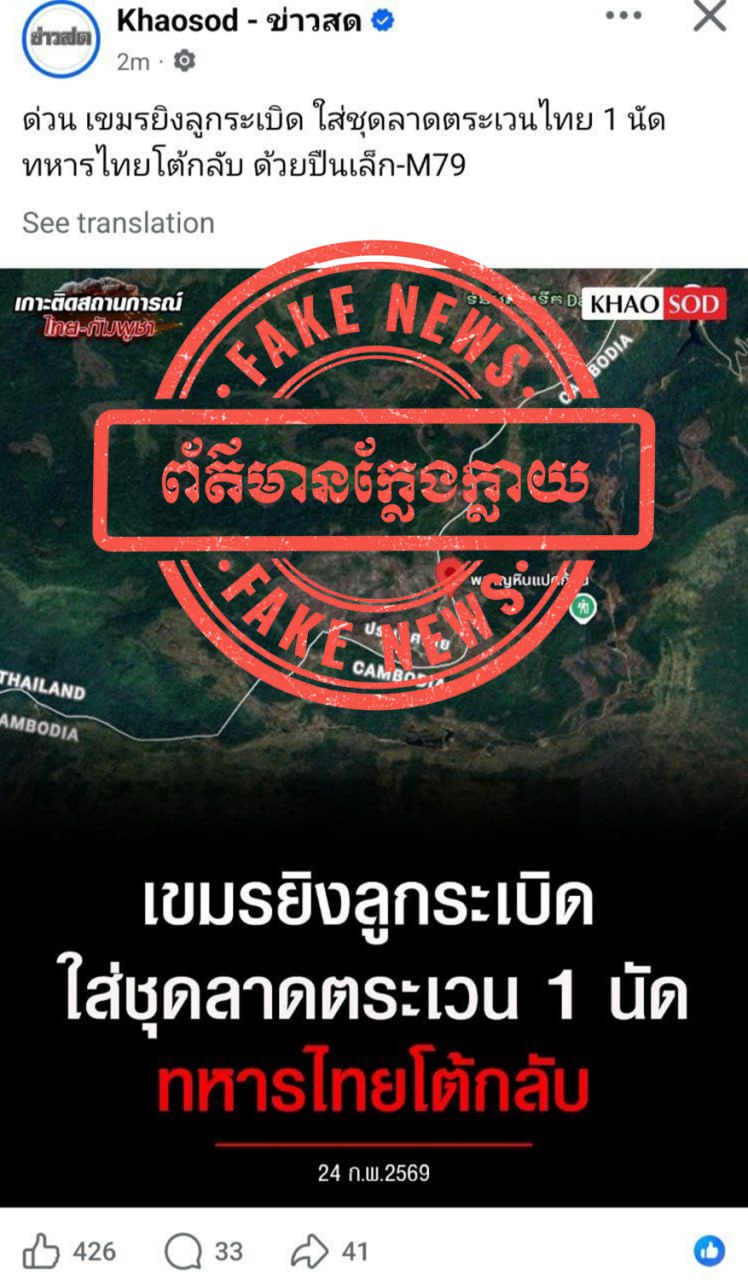 ជាមួយគ្នានេះ ក្រសួងការពារជាតិ សូមអំពាវនាវដល់សាធារណជន និងអ្នកសារព័ត៌មានទាំងអស់ សូមកុំចែករំលែកនូវព័ត៌មានក្លែងក្លាយដែលបានផ្សព្វផ្សាយដោយសារព័ត៌មានថៃខាងលើ ដោយតាមដាន និងទទួលយកតែព័ត៌មានដែលមានប្រភពច្បាស់លាស់ ត្រឹមត្រូវ និងជឿទុកចិត្តបាន ជាពិសេសការផ្តល់ជូនព័ត៌មានដោយរាជរដ្ឋាភិបាល ទំព័រផ្លូវការរបស់ថ្នាក់ដឹកនាំ ក្រសួង និងអង្គភាពពាក់ព័ន្ធរបស់យើង៕