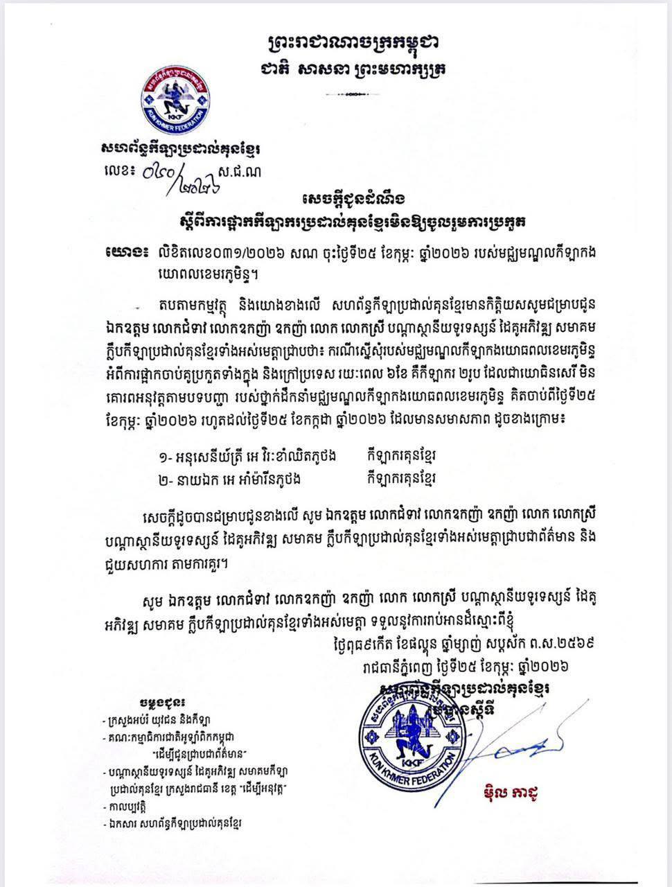 សូមបញ្ជាក់ថា សហព័ន្ធកីឡាប្រដាល់គុនខ្មែរ ផ្អាកចាប់គូប្រកួតទាំងក្នុង និងក្រៅប្រទេស រយៈពេល ៦ខែ គឺកីឡាករ ២រូប រួមមាន១- អនុសេនីយ៍ត្រី អេ វិរៈខាំឈិតភូថង ២- នាយឯក អេ អាំម៉ារីនភូថង កីឡាករគុនខ្មែរ កីឡាករគុនខ្មែរ ដែលមិនគោរពអនុវត្តតាមបទបញ្ជា របស់ថ្នាក់ដឹកនាំមជ្ឈមណ្ឌលកីឡាកងយោធពលខេមរភូមិន្ទ គិតចាប់ពីថ្ងៃទី២៥ ខែកុម្ភៈ ឆ្នាំ២០២៦ រហូតដល់ថ្ងៃទី២៥ ខែកក្កដា ឆ្នាំ២០២៦ ៕