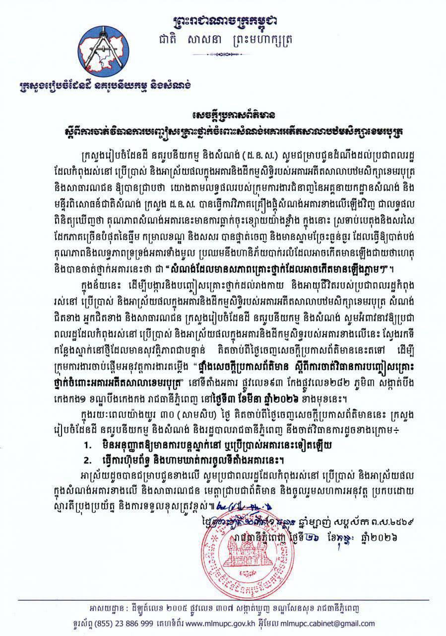 ដើម្បីបង្ការ និងបញ្ចៀសគ្រោះថ្នាក់ដល់រាងកាយ និងអាយុជីវិតរបស់ប្រជាពលរដ្ឋកំពុង រស់នៅ ប្រើប្រាស់ និងអាស្រ័យផលក្នុងអគារនិងដីកម្មសិទ្ធិរបស់អគារអតីតសាលាបឋមសិក្សាខេមរបុត្រ សំណង់ជិតខាង អ្នកជិតខាង និងសាធារណជន ក្រសួងរៀបចំដែនដី អំពាវនាវឲ្យប្រជាពលរដ្ឋដែលកំពុងរស់នៅនេះ ស្វែងរកទីកន្លែងស្នាក់នៅថ្មីដែលមានសុវត្ថិភាពជាបន្ទាន់ ដើម្បីក្រុមការងារចាប់ផ្តើមអនុវត្តការងារតម្លើង “ផ្ទាំងសេចក្តីប្រកាសព័ត៌មាន ស្តីពីការចាត់វិធានការបញ្ចៀសគ្រោះ ថ្នាក់ចំពោះអគារអតីតសាលាខេមរបុត្រ”។