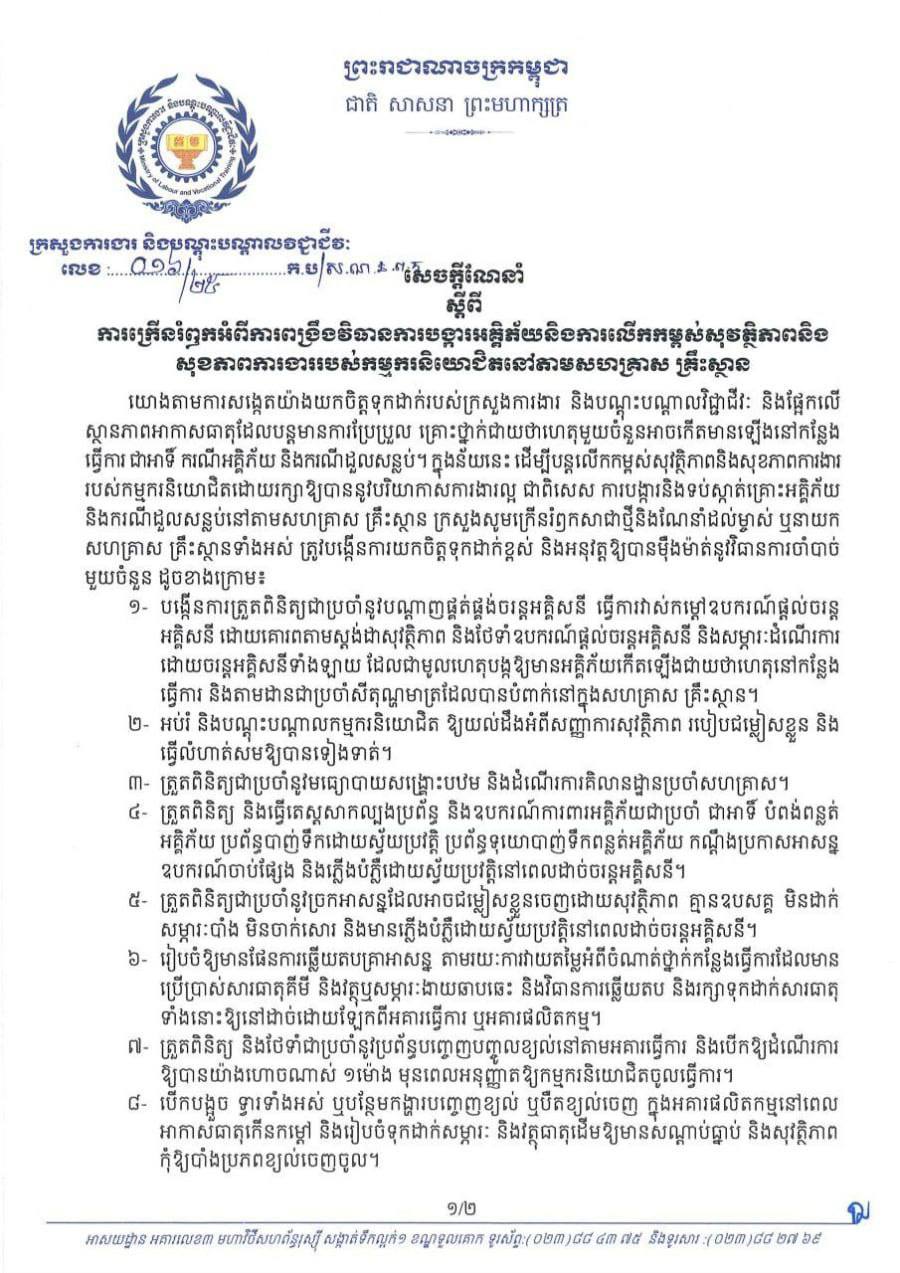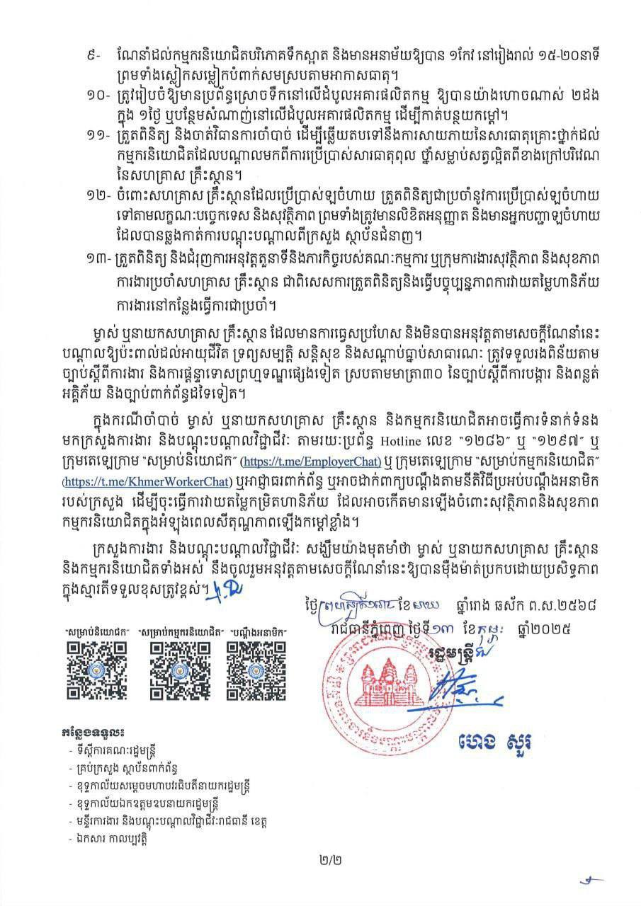 លោក ស៊ុន មេសា ក្នុងករណីចាំបាច់ ម្ចាស់ ឬនាយកសហគ្រាស គ្រឹះស្ថាន និងកម្មករនិយោជិត អាចធ្វើការទំនាក់ទំនង មកក្រសួងការងារ និងបណ្តុះបណ្តាលវិជ្ជាជីវៈ តាមរយៈប្រព័ន្ធ Hotline លេខ "១២៨៦" ឬអាជ្ញាធរមានសមត្ថកិច្ចពាក់ព័ន្ធ ឬអាចដាក់ពាក្យបណ្តឹងតាមនីតិវិធីប្រអប់ បណ្តឹងអនាមិករបស់ក្រសួង ដើម្បីចុះធ្វើការវាយតម្លៃកម្រិតហានិភ័យ ដែលអាចកើតមានឡើងចំពោះសុវត្ថិភាព និងសុខភាពកម្មករនិយោជិតក្នុងអំឡុងពេលសីតុណ្ហភាពនៅក្នុងសហគ្រាស គ្រឹះស្ថានឡើងកម្ដៅខ្លាំង៕