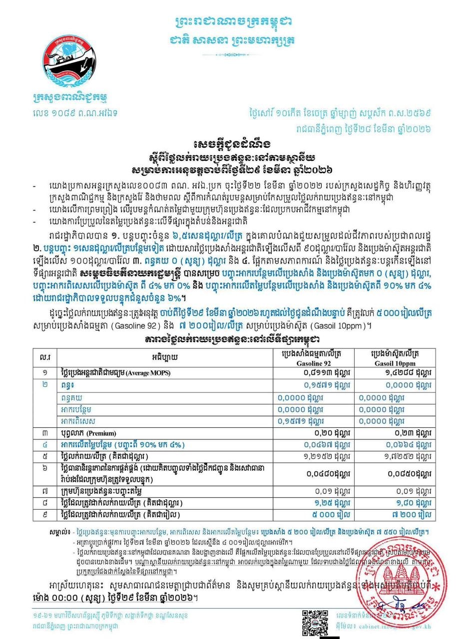 ភ្នំពេញៈ ក្រសួងពាណិជ្ជកម្មចេញសេចក្តីជូនដំណឹង ស្តីពីថ្លៃលក់រាយប្រេងឥន្ធនៈនៅតាមស្ថានីយ សម្រាប់ការអនុវត្តចាប់ពីម៉ោង ០០:០០ (សូន្យ) ថ្ងៃទី២៩ ខែមីនា ឆ្នាំ២០២៦ រហូតដល់ថ្ងៃជូនដំណឹងបន្ទាប់