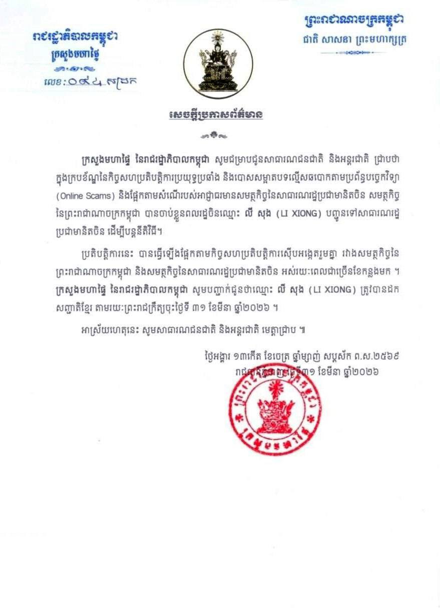 ក្រសួងមហាផ្ទៃ នៃរាជរដ្ឋាភិបាលកម្ពុជា បានបញ្ជាក់ថា ឈ្មោះ លី សុង (LI XIONG) ត្រូវបានដកសញ្ជាតិខ្មែរ តាមរយៈព្រះរាជក្រឹត្យចុះថ្ងៃទី៣១ ខែមីនា ឆ្នាំ២០២៦៕