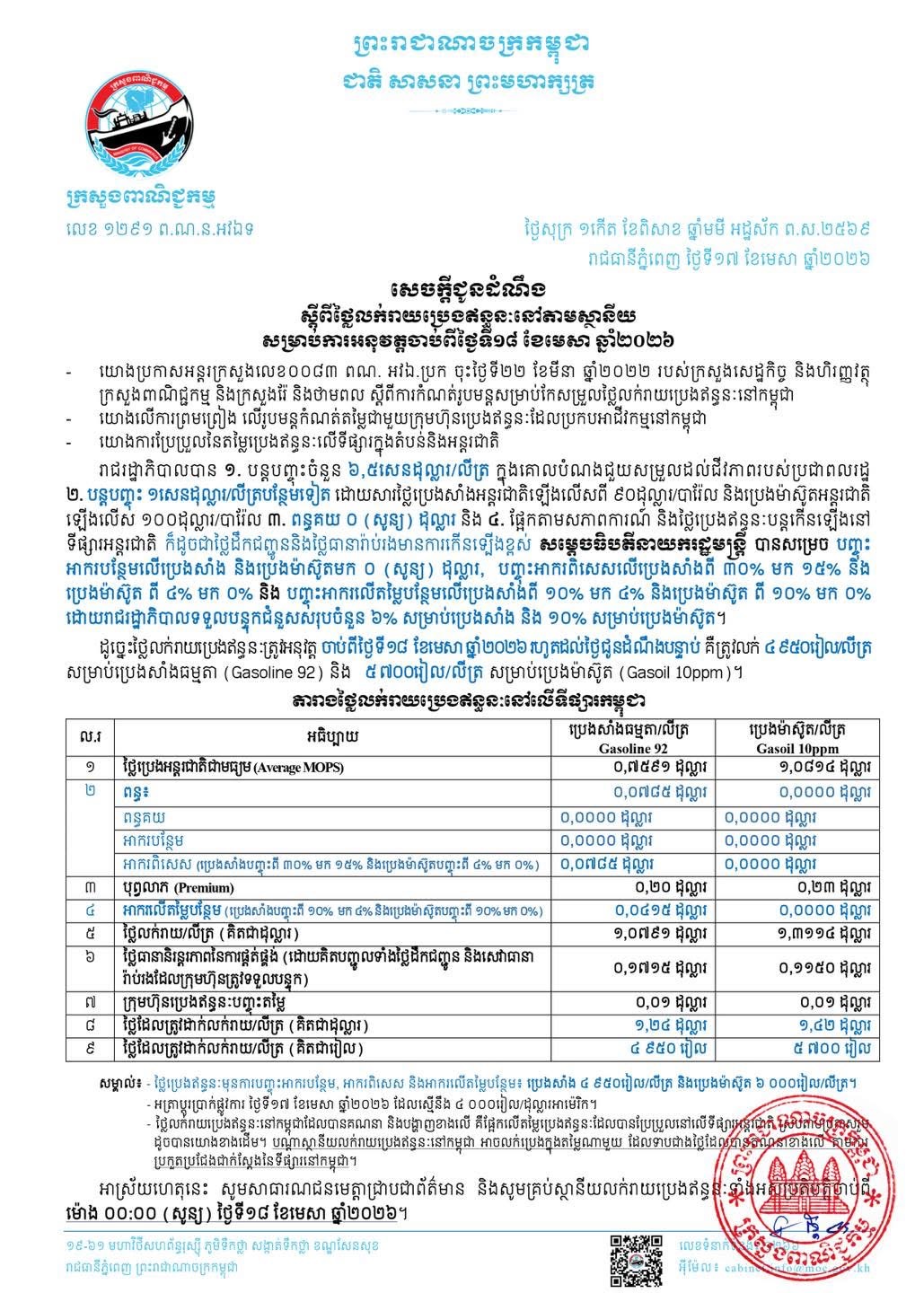 ភ្នំពេញៈ ក្រសួងពាណិជ្ជកម្ម សេចក្តីជូនដំណឹងស្តីពីថ្លៃលក់រាយប្រេងឥន្ធនៈនៅតាមស្ថានីយ សម្រាប់ការអនុវត្តចាប់ពីម៉ោង ០០:០០ (សូន្យ) ថ្ងៃទី១៨ ខែមេសា ឆ្នាំ២០២៦ រហូតដល់ថ្ងៃជូនដំណឹងបន្ទាប់