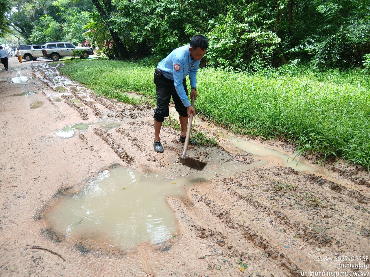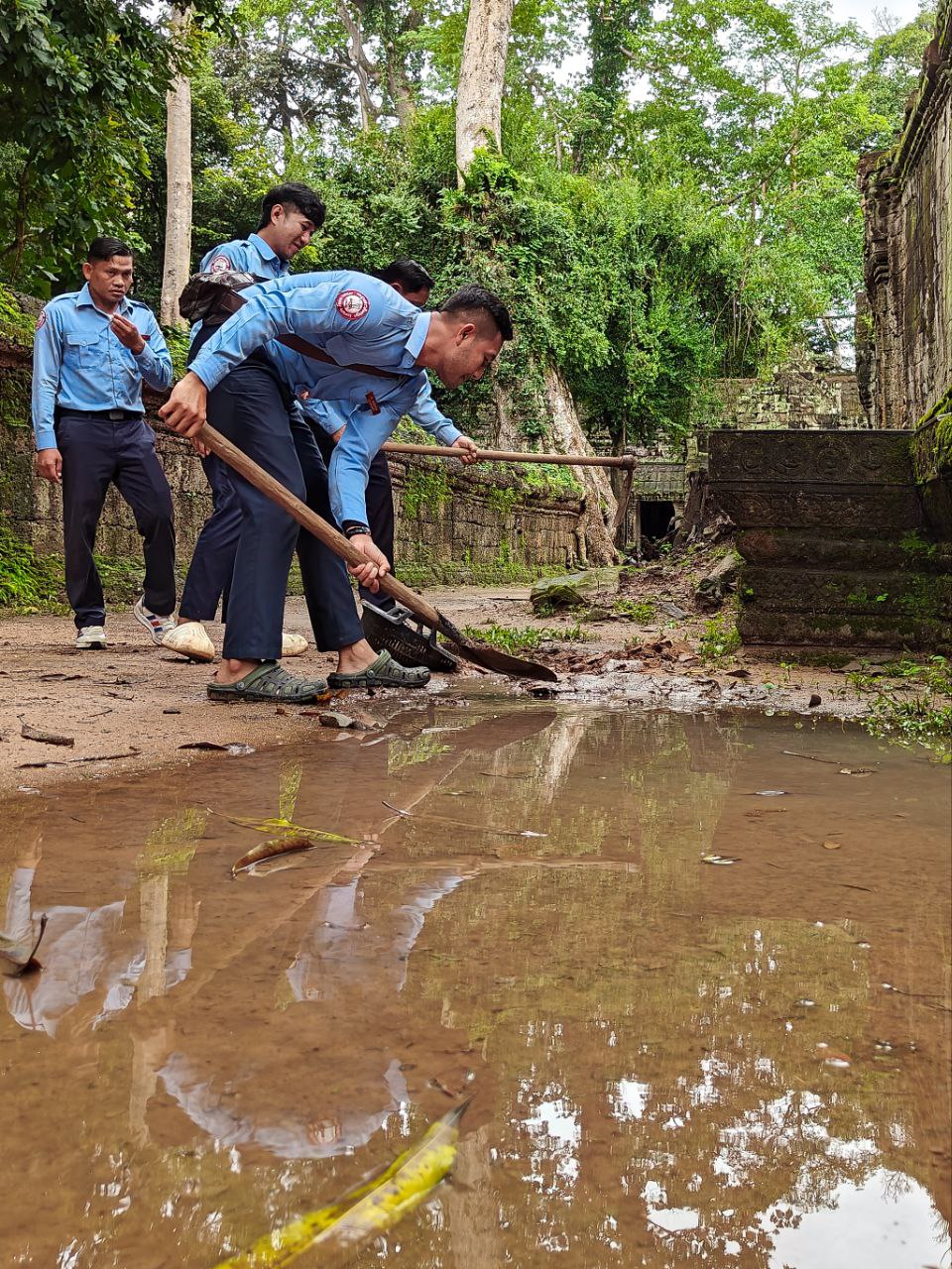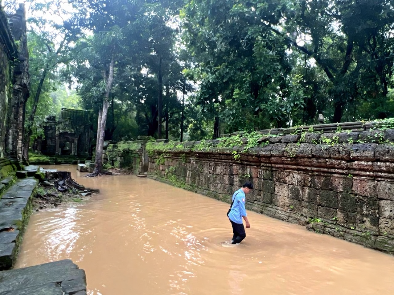 លោក ស៊ុន កែវភក្តី ប្រធានក្រុមភ្នាក់ងារទេសចរប្រចាំប្រាសាទតាព្រហ្ម បានឱ្យដឹងថា ជារឿយៗអំឡុងពេលមានភ្លៀងធ្លាក់ខ្លាំងម្តងៗ បរិវេណប្រាសាទតាព្រហ្មដែលផ្នែកខាងក្នុងរៀងទំនាប តែងមានទឹកដក់ តួយ៉ាងនៅជ្រុងខាងត្បូងនៃសាលរបាំជាដើម។ ប្រធានក្រុមរូបនេះបញ្ជាក់ថា លោកតែងដឹកនាំក្រុមការងារដើម្បីកាយធ្វើចង្អូររំដោះទឹក ឬកាយយកកម្ទេចដី ឬរុក្ខជាតិតូច នៅតាមមាត់លូ ដើម្បីឱ្យទឹកហូរបានលឿន សម្រួលដល់ការដើរទស្សនារបស់ភ្ញៀវទេសចរឡើងវិញ។