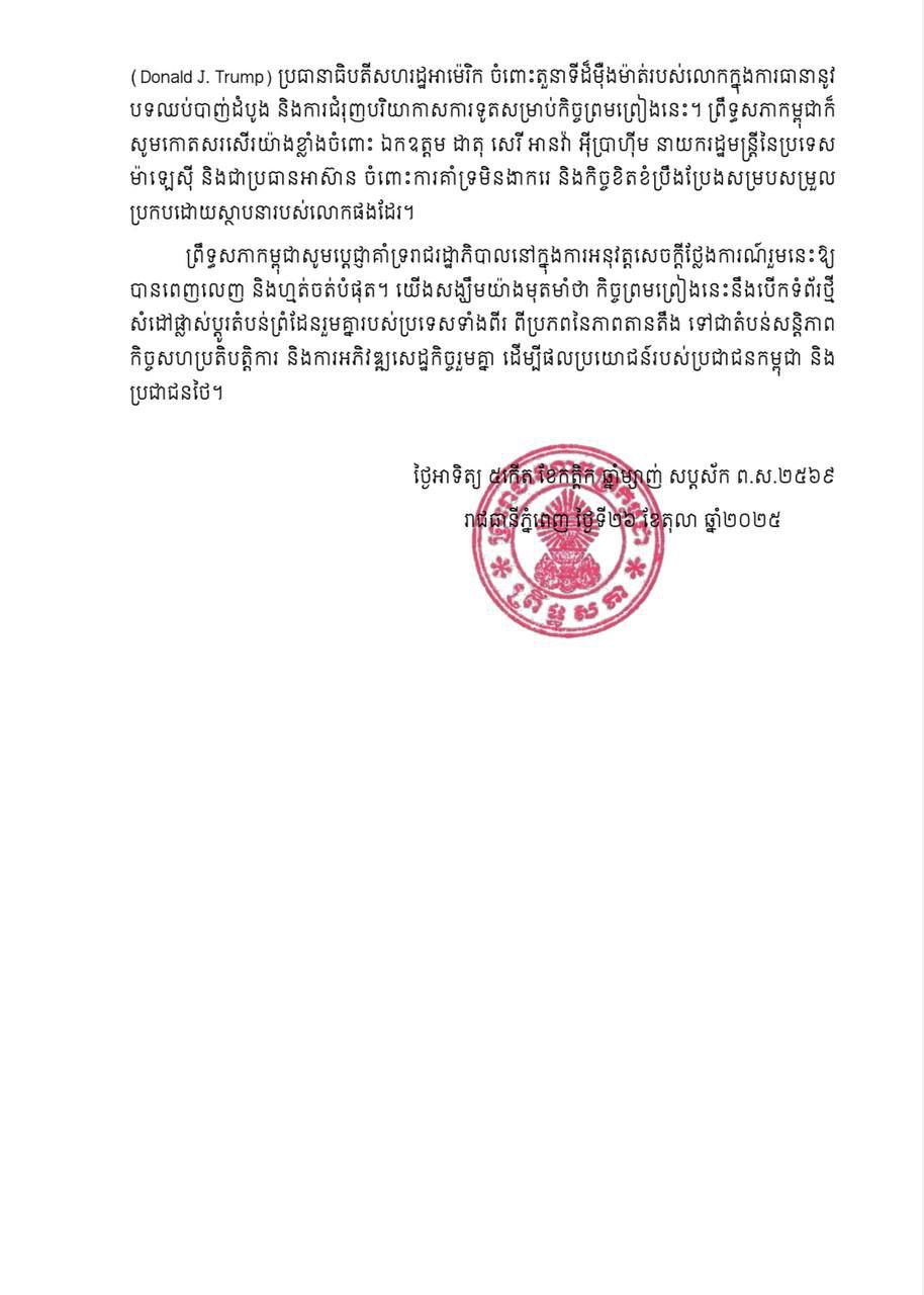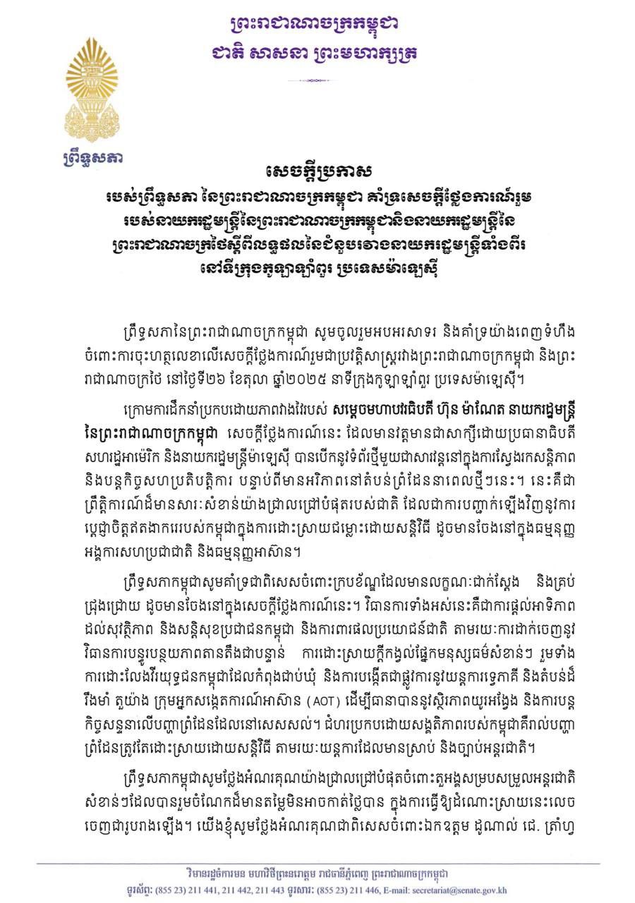 ភ្នំពេញៈ ព្រឹទ្ធសភា សភា នៃព្រះរាជាណាចក្រកម្ពុជា ប្រកាសគាំទ្រសេចក្តីថ្លែងការណ៍រួម របស់នាយករដ្ឋមន្ត្រីនៃព្រះរាជាណាចក្រកម្ពុជានិងនាយករដ្ឋមន្ត្រីនៃ ព្រះរាជាណាចក្រថៃស្តីពីលទ្ធផលនៃជំនួបរវាងនាយករដ្ឋមន្ត្រីទាំងពីរ នៅទីក្រុងកូឡាឡាំពួរ ប្រទេសម៉ាឡេស៊ី
