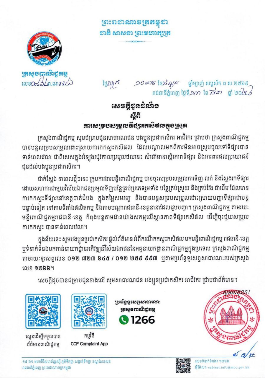 ក្រសួងពាណិជ្ជកម្ម សូមជម្រាបជូនបងប្អូនប្រជាកសិករ អាជីវករ ជ្រាបថា ក្រសួងពាណិជ្ជកម្ម បានបន្តសម្របសម្រួលដោះស្រាយការកកស្ទះកសិផល ដែលបណ្តាលមកពីការមិនអាចស្រូបចូលទៅទីផ្សារបានទាន់ពេលវេលា ជាពិសេសក្នុងអំឡុងរដូវកាលប្រមូលផលនេះ សំដៅធានាស្ថិរភាពទីផ្សារ និងការពារផលប្រយោជន៍ ជូនដល់បងប្អូនប្រជាកសិករ។