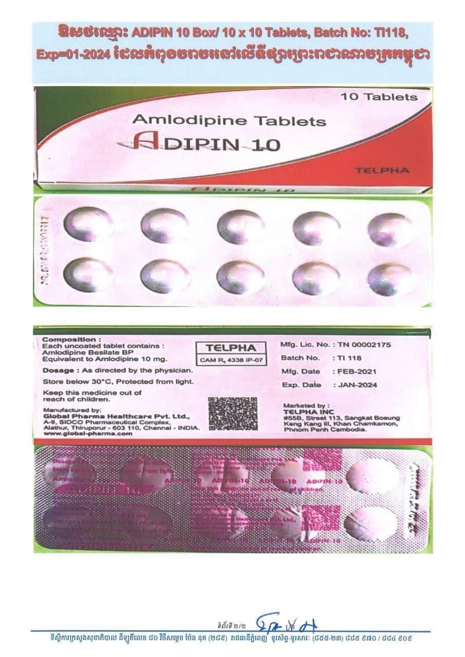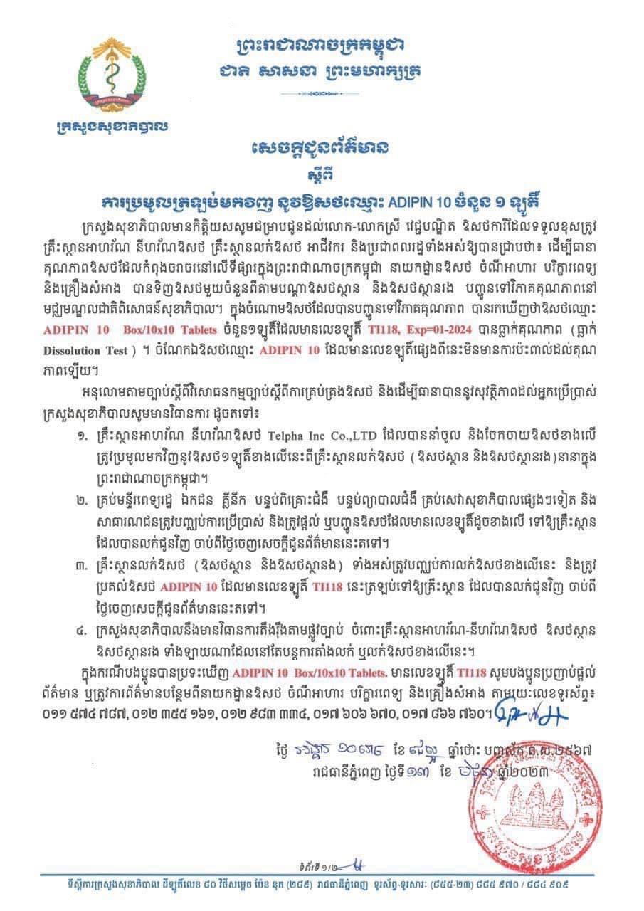 យោងតាមសេចក្ដីជូនដំណឹងរបស់ក្រសួងសុខាភិបាល កាលពីថ្ងៃទី១៣ មិថុនា បានបញ្ជាក់ថា ដោយអនុលោមតាមច្បាប់ស្ដីពីវិសោធនកម្មច្បាប់ស្តីពីការគ្រប់គ្រងឱសថ និងដើម្បីធានាបាននូវសុវត្ថិភាពដល់អ្នកប្រើប្រាស់ ក្រសួងសុខាភិបាលសូមមានវិធានការ ដូចតទៅ៖ ១. គ្រឹះស្ថានអាហរ័ណ នីហរ័ណឱសថ Telpha Inc Co.,LTD ដែលបាននាំចូល និងចែកចាយឱសថខាងលើ ត្រូវប្រមូលមកវិញនូវឱសថ១ឡូត៏ខាងលើនេះពីគ្រឹះស្ថានលក់ឱសថ (ឱសថស្ថាន និងឱសថស្ថានរង)នានាក្នុង ព្រះរាជាណាចក្រកម្ពុជា។ ២គ្រប់មន្ទីរពេទ្យរដ្ឋ ឯកជន គ្លីនីក បន្ទប់ពិគ្រោះជំងឺ បន្ទប់ព្យាបាលជំងឺ គ្រប់សេវាសុខាភិបាលផ្សេងៗទៀត និង សាធារណជនត្រូវបញ្ឈប់ការប្រើប្រាស់ និងត្រូវផ្តល់ ឬបញ្ជូនឱសថដែលមានលេខឡូតិ៍ដូចខាងលើ ទៅឱ្យគ្រឹះស្ថាន ដែលបានលក់ជូនវិញ ចាប់ពីថ្ងៃចេញសេចក្តីជូនព័ត៌មាននេះតទៅ។ ៣គ្រឹះស្ថានលក់ឱសថ ឱសថស្ថាន និងឱសថស្ថានិង) ទាំងអស់ត្រូវបញ្ឈប់ការលក់ឱសថខាងលើនេះ និងត្រូវ ប្រគល់ឱសថ ADIPIN 18 ដែលមានលេខឡូតិ៍ TI118 នេះត្រឡប់ទៅឱ្យគ្រឹះស្ថាន ដែលបានលក់ជូនវិញ ចាប់ពី ថ្ងៃចេញសេចក្តីជូនព័ត៌មាននេះតទៅ។ ៤. ក្រសួងសុខាភិបាលនឹងមានវិធានការតឹងរ៉ឹងតាមផ្លូវច្បាប់ ចំពោះគ្រឹះស្ថានអាហរ័ណ-នីហរ័ណឱសថ ឱសថស្ថាន ឱសថស្ថានរង ទាំងឡាយណាដែលនៅតែបន្តការតាំងលក់ ឬលក់ឱសថខាងលើនេះ។