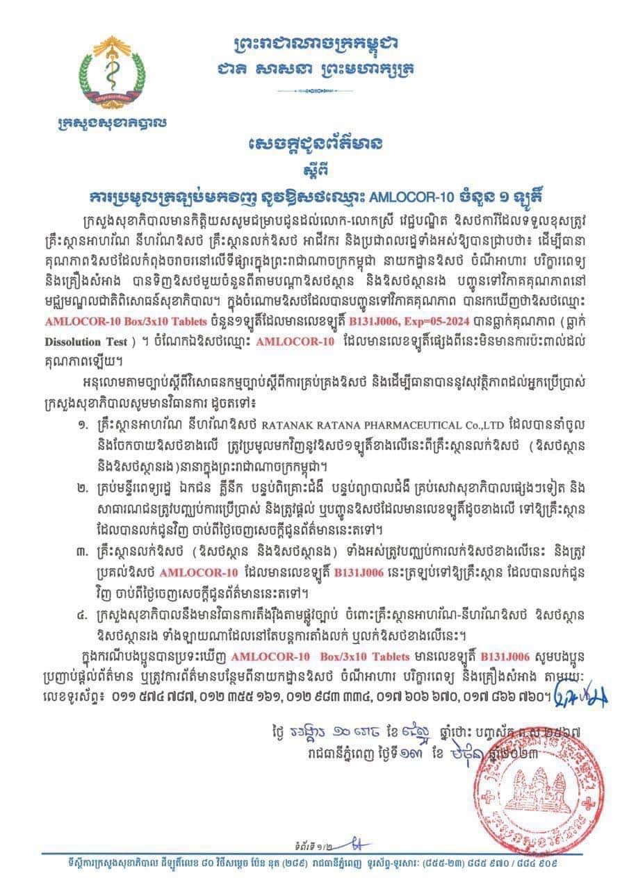 ក្នុងចំណោមឱសថដែលបានបញ្ជូនទៅវិភាគគុណភាព បានរកឃើញថាឱសថឈ្មោះ AMLOCOR-10 Box/3x18 Tablets ចំនួន១ឡូតិ៍ដែលមានលេខឡូត៏ BI31,006, Exp−05-2024 បានធ្លាក់គុណភាព (ធ្លាក់ Dissolution Test) ។ ចំណែកឯឱសថឈ្មោះ AMLOCOR-10 ដែលមានលេខឡូត៏ផ្សេងពីនេះមិនមានការប៉ះពាល់ដល់ គុណភាពឡើយ។ អនុលោមតាមច្បាប់ស្ដីពីវិសោធនកម្មច្បាប់ស្តីពីការគ្រប់គ្រងឱសថ និងដើម្បីធានាបាននូវសុវត្ថិភាពដល់អ្នកប្រើប្រាស់ ក្រសួងសុខាភិបាលសូមមានវិធានការ ដូចតទៅ៖ ១គ្រឹះស្ថានអាហរ័ណ នីហរ័ណឱសថ RATANAK RATANA PHARMACEUTICAL Co.,LTD ដែលបាននាំចូល និងចែកចាយឱសថខាងលើ ត្រូវប្រមូលមកវិញនូវឱសថ១ឡូត៍ខាងលើនេះពីគ្រឹះស្ថានលក់ឱសថ ឱសថស្ថាន និងឱសថស្ថានរង)នានាក្នុងព្រះរាជាណាចក្រកម្ពុជា។ ២. គ្រប់មន្ទីរពេទ្យរដ្ឋ ឯកជន គ្លីនីក បន្ទប់ពិគ្រោះជំងឺបន្ទប់ព្យាបាលជំងឺ គ្រប់សេវាសុខាភិបាលផ្សេងៗទៀត និង សាធារណជនត្រូវបញ្ឈប់ការប្រើប្រាស់ និងត្រូវផ្តល់ ឬបញ្ជូនឱសថដែលមានលេខឡូតិ៍ដូចខាងលើ ទៅឱ្យគ្រឹះស្ថាន ដែលបានលក់ជូនវិញ ចាប់ពីថ្ងៃចេញសេចក្តីជូនព័ត៌មាននេះតទៅ។ ៣. គ្រឹះស្ថានលក់ឱសថ (ឱសថស្ថាន និងឱសថស្ថានិង ទាំងអស់ត្រូវបញ្ឈប់ការលក់ឱសថខាងលើនេះ និងត្រូវ ប្រគល់ឱសថ AMLOCOR-10 ដែលមានលេខឡូត៏ BIII.J006 នេះត្រឡប់ទៅឱ្យគ្រឹះស្ថាន ដែលបានលក់ជូន វិញ ចាប់ពីថ្ងៃចេញសេចក្តីជូនព័ត៌មាននេះតទៅ។ ៤ក្រសួងសុខាភិបាលនឹងមានវិធានការតឹងរ៉ឹងតាមផ្លូវច្បាប់ ចំពោះគ្រឹះស្ថានអាហរ័ណ-នីហរ័ណឱសថ ឱសថស្ថាន ឱសថស្ថានរង ទាំងឡាយណាដែលនៅតែបន្តការតាំងលក់ ឬលក់ឱសថខាងលើនេះ។