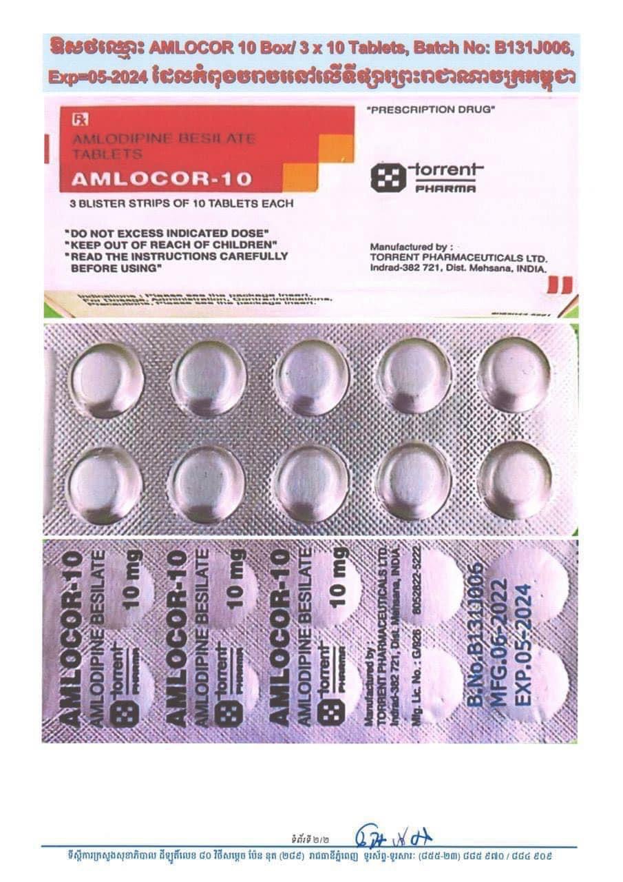 ក្នុងករណីបងប្អូនបានប្រទះឃើញ AMLOCOR-10 Box/3x10 Tablets មានលេខឡូត៏ B131.J006 សូមបងប្អូន ប្រញាប់ផ្ដល់ព័ត៌មាន ឬត្រូវការព័ត៌មានបន្ថែមពីនាយកដ្ឋានឱសថ ចំណ៏អាហារ បរិក្ខារពេទ្យ និងគ្រឿងសំអាង តាមរយៈ លេខទូរស័ព្ទ៖ ០១១ ៥៧៤ ៧៨៧, ០១២ ៣៥៥ ១៦១, ០១២ ៩៨៣ ៣៣៤០១៧ ៦០៦ ៦៧០, ០១៧ ៨៦៦ ៧៦០។