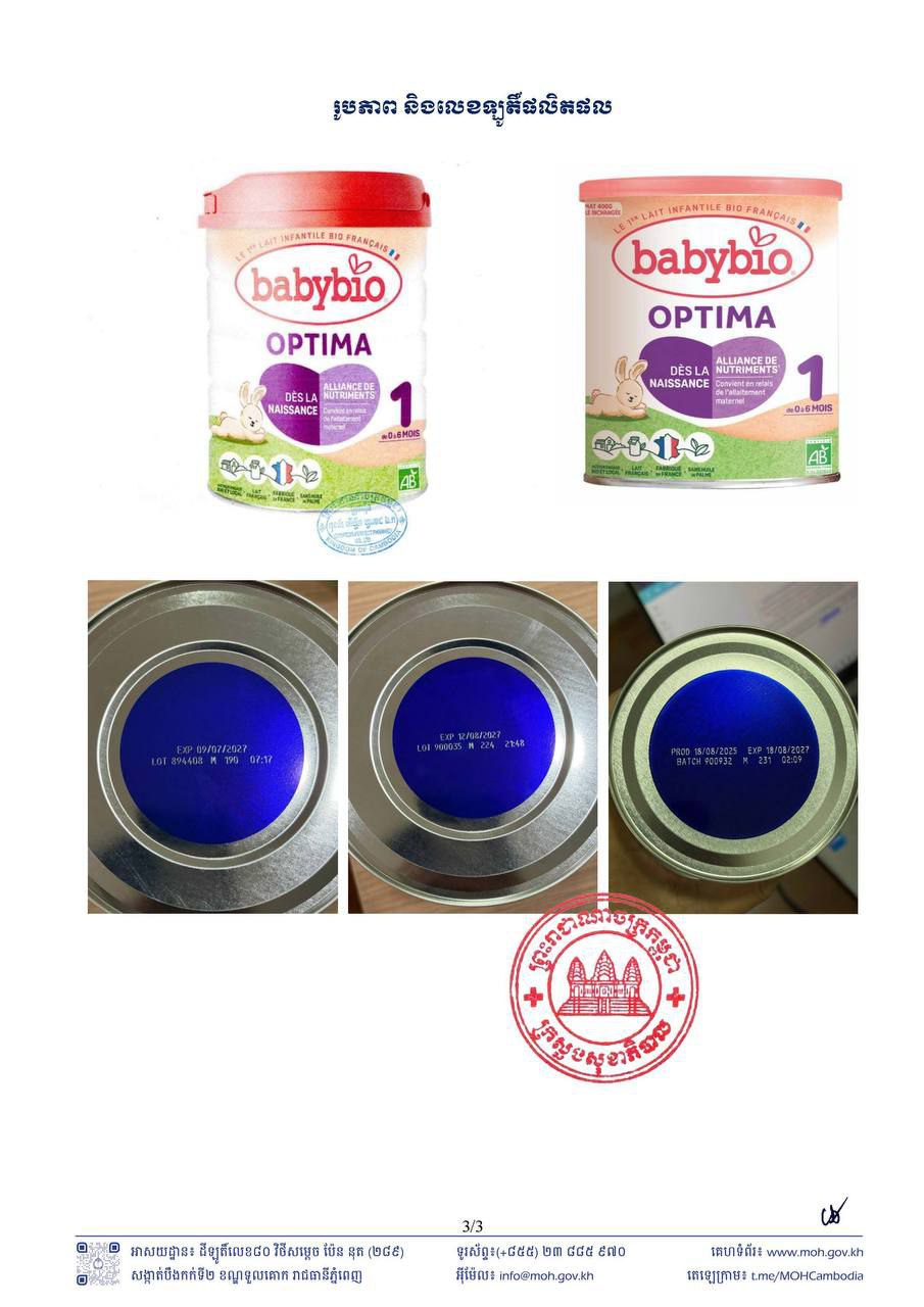 ក្រសួងសុខាភិបាល ប្រកាសកុំឱ្យពលរដ្ឋប្រើប្រាស់នូវផលិតផលទឹកដោះគោម្សៅ Babybio Optima 1