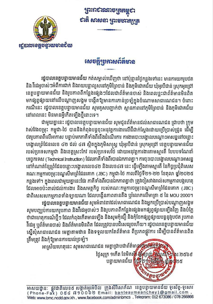 បន្ទាយមានជ័យៈ រដ្ឋបាលខេត្តបន្ទាយមានជ័យបង្ហាញថា ស្ថានភាពនៅភូមិព្រៃចាន់ និងភូមិ ជោគជ័យ នៅពេលនេះមិនមានអ្វីកើតឡើងថ្មីនោះទេខណៈដែលនៅប៉ុន្មានថ្ងៃកន្លងទៅនេះ មានការយករូបថត និងវីដេអូ ចាស់ៗអំពីការដាក់និងរាយបន្លាលួសនៅភូមិព្រៃចាន់ និងភូមិជោគជ័យ ឃុំអូរបីជាន់ ស្រុកអូរជ្រៅ ខេត្ត បន្ទាយមានជ័យ និងរូបភាពពីកន្លែងផ្សេងៗដែលជាព័ត៌មានចាស់ និងពេលខ្លះជាព័ត៌មានមិនពិត មកផ្សព្វផ្សាយនៅលើបណ្តាញសង្គម បង្កើតឱ្យមានការភាន់ច្រឡំក្នុងចំណោមសាធារណជន។