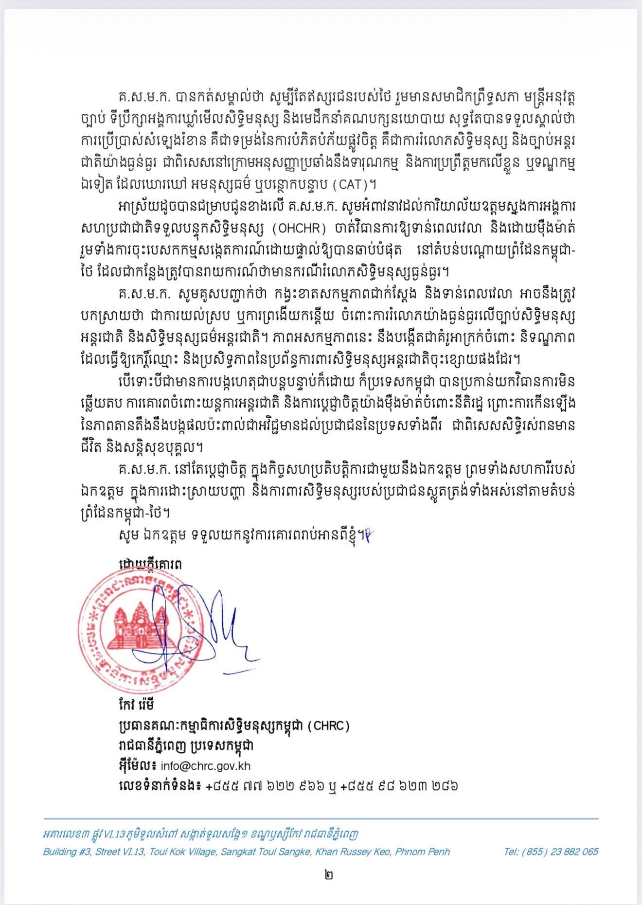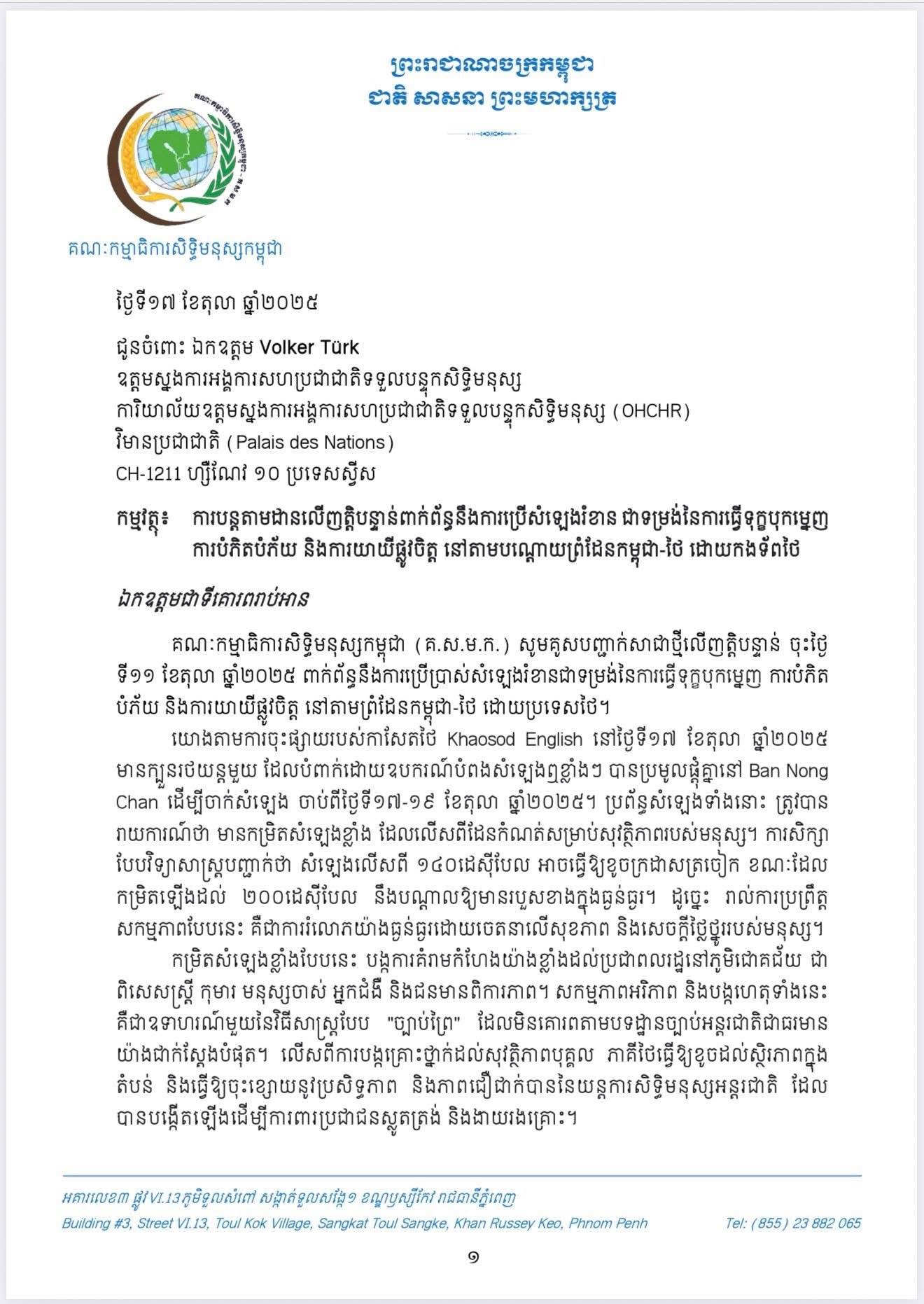 ភ្នំពេញៈ គណៈកម្មាធិការសិទ្ធិមនុស្សកម្ពុជាជំរុញឱ្យ OHCHR ចុះសង្កេតការណ៍ឱ្យបានឆាប់ដោយផ្ទាល់ ពាក់ព័ន្ធនឹងការប្រើសំឡេងរំខានជាបន្តបន្ទាប់ក្នុងការធ្វើទុក្ខបុកម្នេញ ការបំភិតបំភ័យ និងការយាយីផ្លូវចិត្តដល់កុមារ ស្ត្រីមានផ្ទៃពោះ មនុស្សចាស់ និងជនងាយរងគ្រោះដទៃទៀតនៅតាមបណ្តោយព្រំដែនកម្ពុជា-ថៃ។