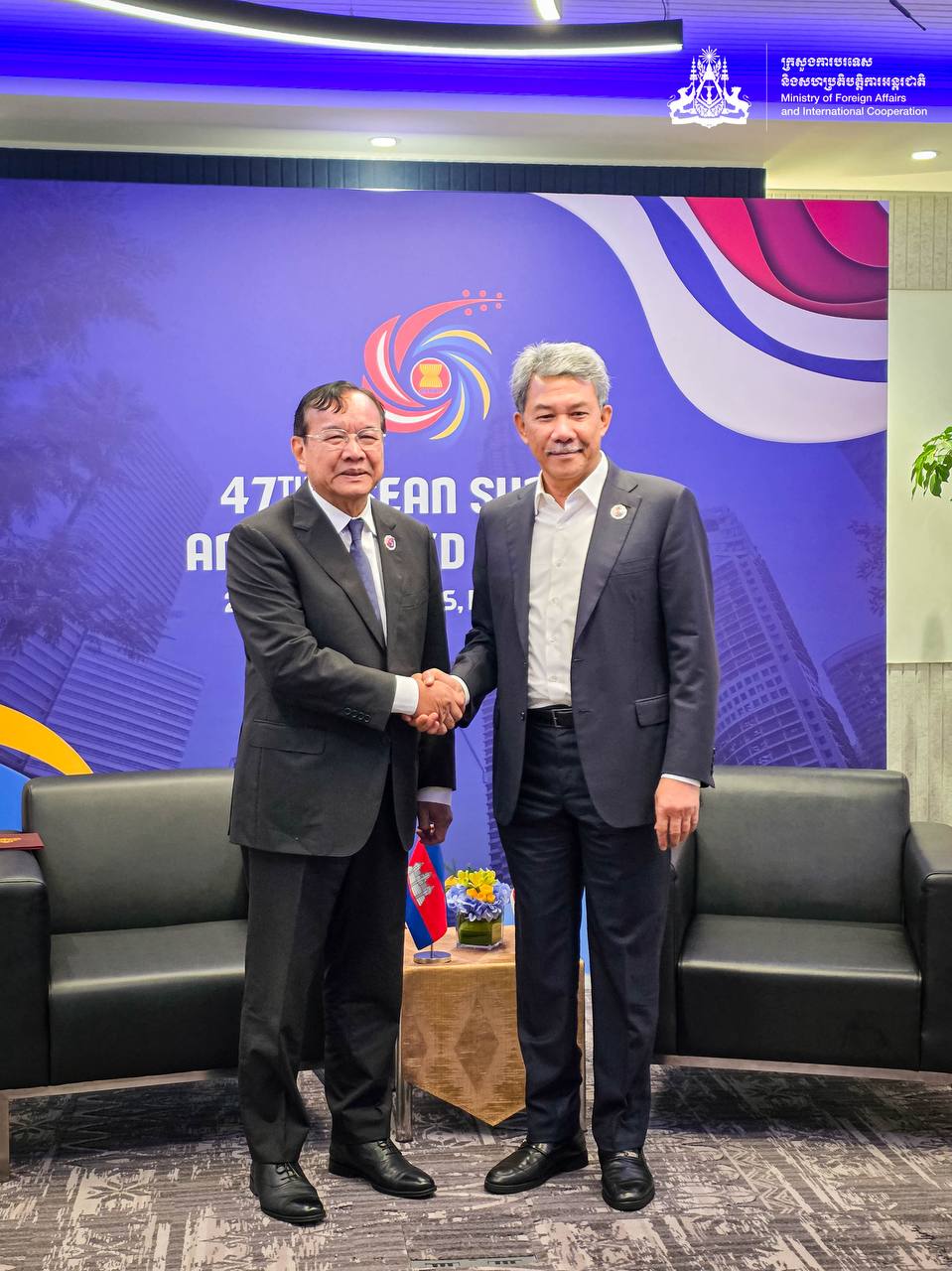 ម៉ាឡេស៊ីៈ នៅរសៀលថ្ងៃទី ២៤ ខែតុលា ឆ្នាំ២០២៥ លោកឧបនាយករដ្ឋមន្ត្រី ប្រាក់ សុខុន រដ្ឋមន្ត្រីការបរទេស និងសហប្រតិបត្តិការអន្តរជាតិ បានអញ្ជើញជួបពិភាក្សាក្រៅផ្លូវការជាមួយ លោក Dato' Seri Utama Haji Mohamad bin Haji Hasan រដ្ឋមន្ត្រីការបរទេសម៉ាឡេស៊ី ក្នុងឱកាសអញ្ជើញចូលរួមកិច្ចប្រជុំកំពូលអាស៊ាន លើកទី៤៧ និងកិច្ចប្រជុំពាក់ព័ន្ធ នៅទីក្រុងគូឡាឡាំពួ ប្រទេសម៉ាឡេស៊ី។
