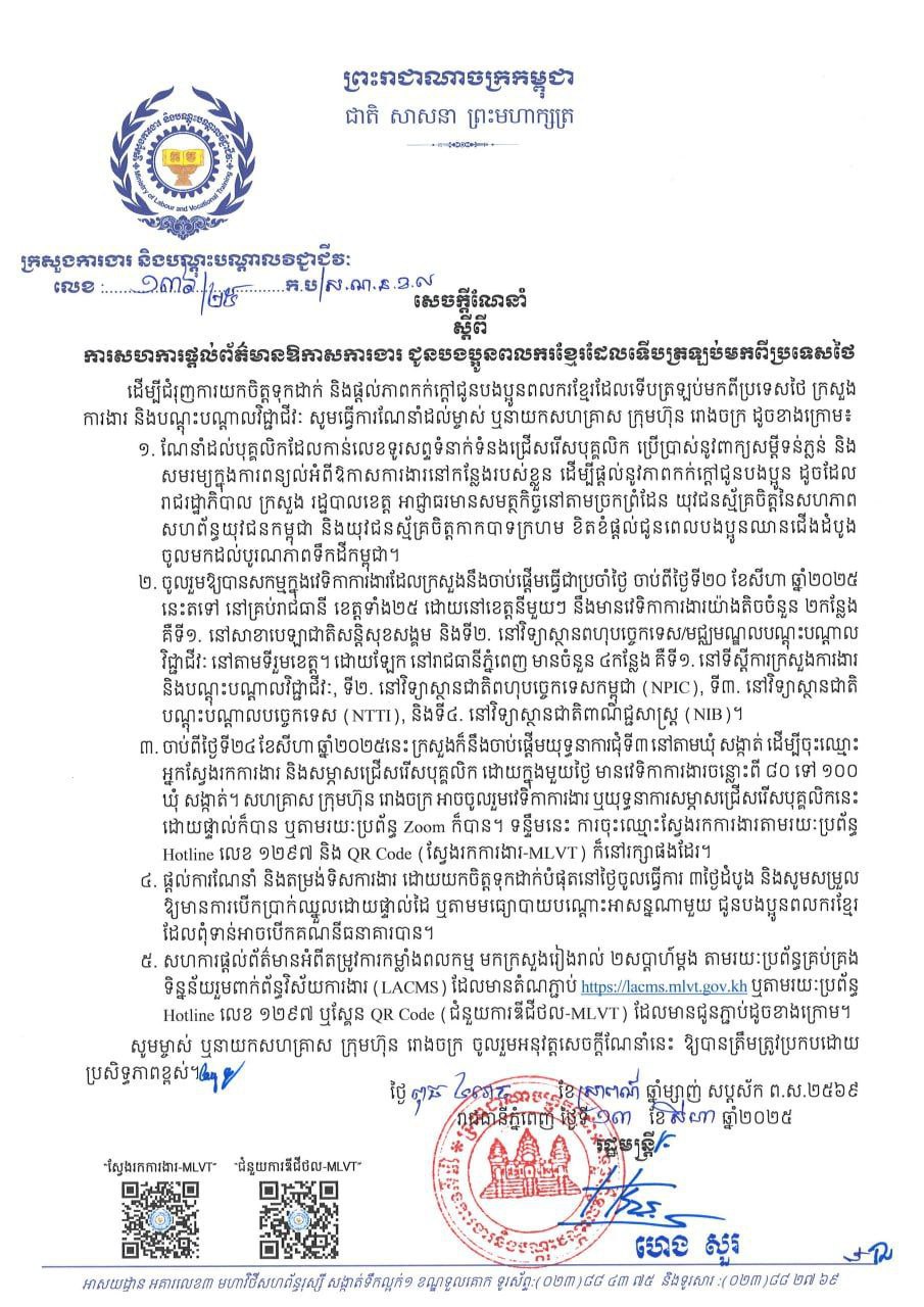 លោកសូមអំពាវនាវដល់ប្រធានរដ្ឋបាល ប្រធានផ្នែក ប្រធានក្រុមកាត់ដេរ និងជំនួយការនៅតាមសហគ្រាស ក្រុមហ៊ុន រោងចក្រទាំងអស់ មេត្តាប្រើពាក្យសម្តីឱ្យបានទន់ភ្លន់ក្នុងការបំពេញការងារជាមួយកម្មករនិយោជិត ជាពិសេស បងប្អូនអតីតពលករខ្មែរត្រឡប់មកពីប្រទេសថៃ សូមកុំមានការជេរប្រមាថ ហើយបងប្អូនកម្មករ ឬនិយោជិតទាំងអស់អាចប្តឹងមកក្រសួង មកអ្នកនាំពាក្យ ឬបណ្តឹងអនាមឹករបស់ក្រសួង»។