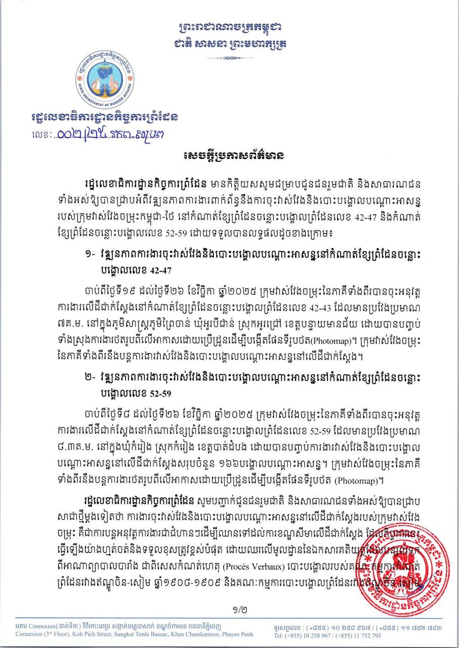 ភ្នំពេញៈ រដ្ឋលេខាធិការដ្ឋានកិច្ចការព្រំដែន បង្ហាញអំពីវឌ្ឍនភាពការងារពាក់ព័ន្ធនឹងការចុះវាស់វែងនិងបោះបង្គោលបណ្តោះអាសន្នរបស់ក្រុមវាស់វែងចម្រុះកម្ពុជា-ថៃ នៅកំណាត់ខ្សែព្រំដែនចន្លោះបង្គោលព្រំដែនលេខ 42-47 និងកំណាត់ខ្សែព្រំដែនចន្លោះបង្គោលព្រំដែនលេខ 52-59។