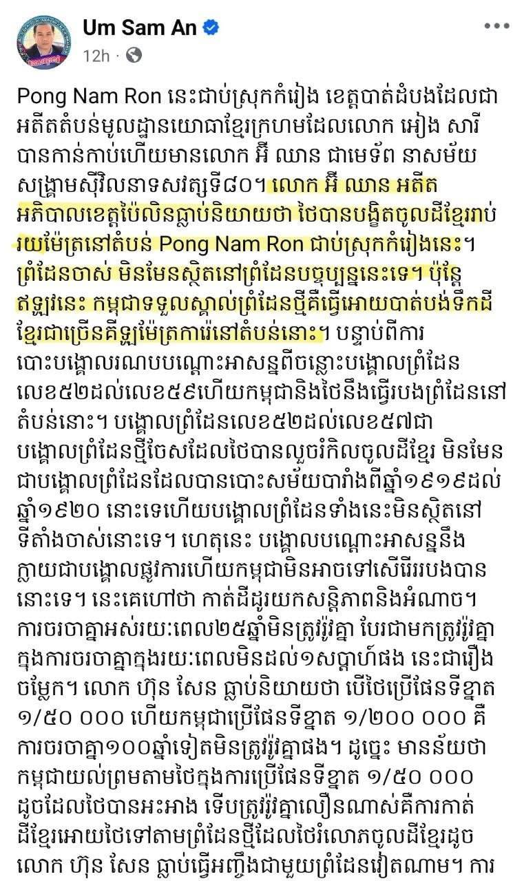 ក្នុងកាលៈទេសៈដែលយើងកំពុងដោះស្រាយបញ្ហាព្រំដែនជាមួយប្រទេសជិតខាង សម្ដេចធិបតីមិនចង់មានការឆ្លើយឆ្លងជាមួយអ្នកនយោបាយខ្មែរមួយចំនួននោះទេ។ ក៏ប៉ុន្តែពេលខ្លះក៏មានការចាំបាច់ក្នុងការលើកឡើងនូវចំណុចមួយចំនួន កុំឱ្យក្រុមអ្នកនយោបាយខ្លះឆ្លៀតប្រឌិតរឿងមិនពិតក្នុងចេតនាកេងចំណេញនយោបាយ និងដើម្បីឱ្យប្រជាពលរដ្ឋមានការយល់ច្រឡំមកលើរាជរដ្ឋាភិបាល។ សម្ដេចធិបតីបានបញ្ជាក់ថា កាលពីព្រឹកមិញនេះ លោក អ៊ុំ សំអាន បានបង្ហោះសារនៅក្នុងគណនីហ្វេសប៊ុករបស់ខ្លួនថា÷ Pong Nam Ron នេះជាប់ស្រុកកំរៀង ខេត្តបាត់ដំបងដែលជាអតីតតំបន់មូលដ្ឋានយោធាខ្មែរក្រហមដែលលោក អៀង សារី បានកាន់កាប់ហើយមានលោក អ៉ី ឈាន ជាមេទ័ព នាសម័យសង្រ្គាមសុីវិលនាទសវត្សទី៨០។