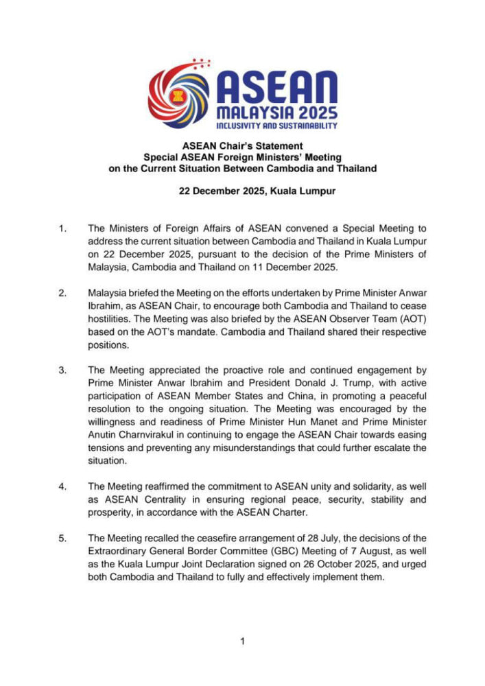 ម៉ាឡេស៊ីៈ ក្រោយពីបញ្ចប់កិច្ចប្រជុំពិសេសរដ្ឋមន្ត្រីការបរទេសអាស៊ាន ស្តីពីស្ថានភាពបច្ចុប្បន្នកម្ពុជា-ថៃ នៅទីក្រុងកូឡាឡាំពួ ប្រទេសម៉ាឡេស៊ី នៅរសៀល ថ្ងៃទី២២ ខែធ្នូ ឆ្នាំ២០២៥នេះ បានចេញសេចក្តីថ្លែងការណ៍ប្រធានអាស៊ាន ស្តីពីលទ្ធផលនៃកិច្ចប្រជុំពិសេស ដោយក្រុមរដ្ឋមន្រ្តីការបរទេសអាស៊ាន បានស្វាគមន៍ចំពោះ កិច្ចពិភាក្សាស្តីពីការបន្តបទឈប់បាញ់ឡើងវិញ និងការបញ្ឈប់អរិភាពនានារបស់កម្ពុជា-ថៃ។