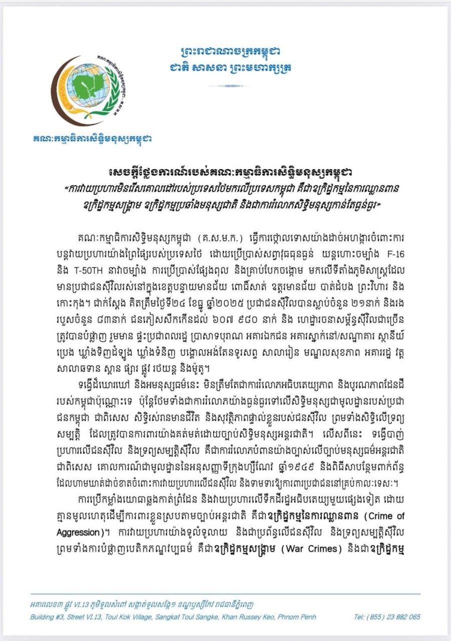គណៈកម្មាធិការសិទ្ធិមនុស្សកម្ពុជា៖ « ការវាយប្រហារមិនរើសគោលដៅរបស់ប្រទេសថៃមកលើប្រទេសកម្ពុជា គឺជាឧក្រិដ្ឋកម្មនៃការឈ្លានពាន ឧក្រិដ្ឋកម្មសង្គ្រាម ឧក្រិដ្ឋកម្មប្រឆាំងមនុស្សជាតិ និងជាការរំលោភសិទ្ធិមនុស្សកាន់តែធ្ងន់ធ្ងរ»