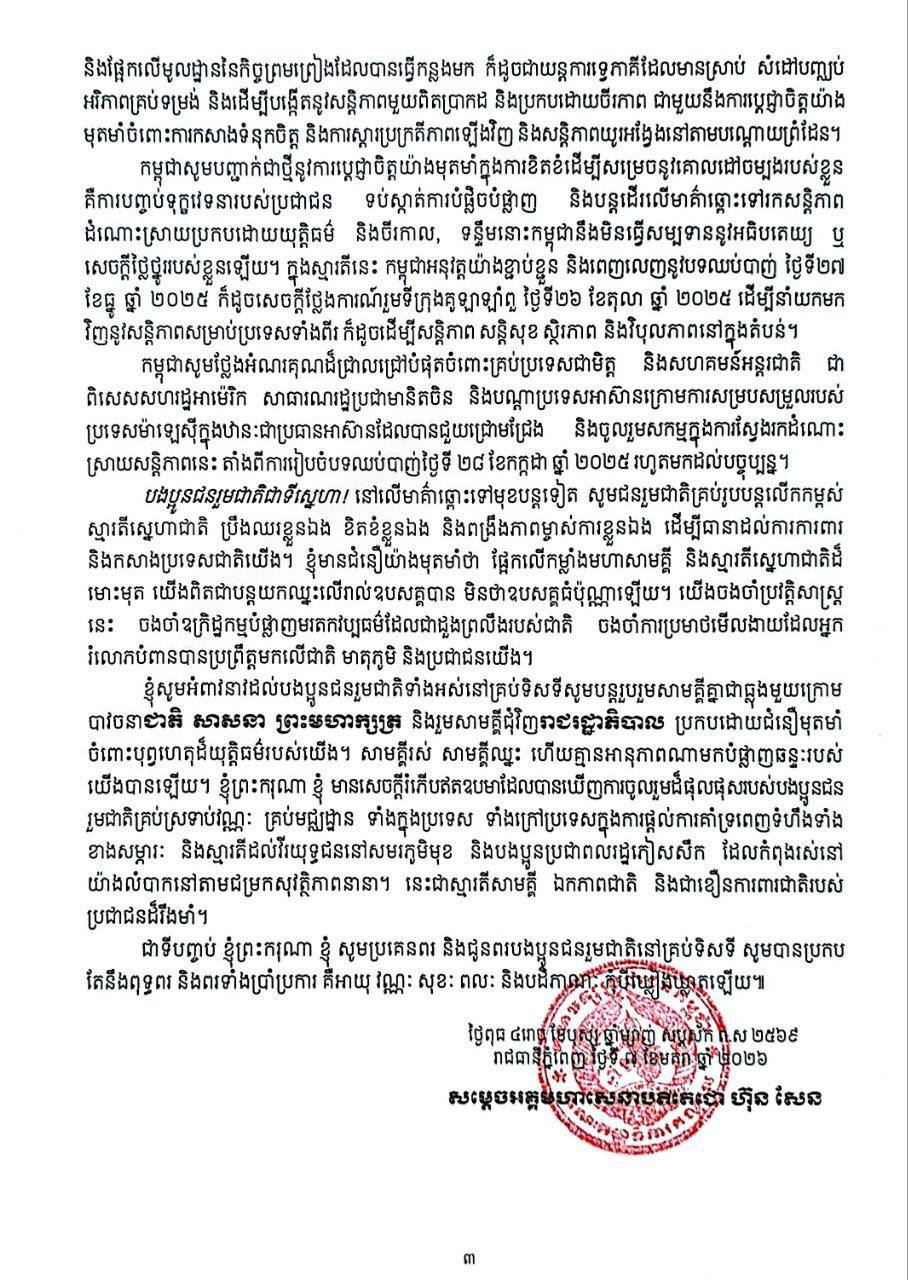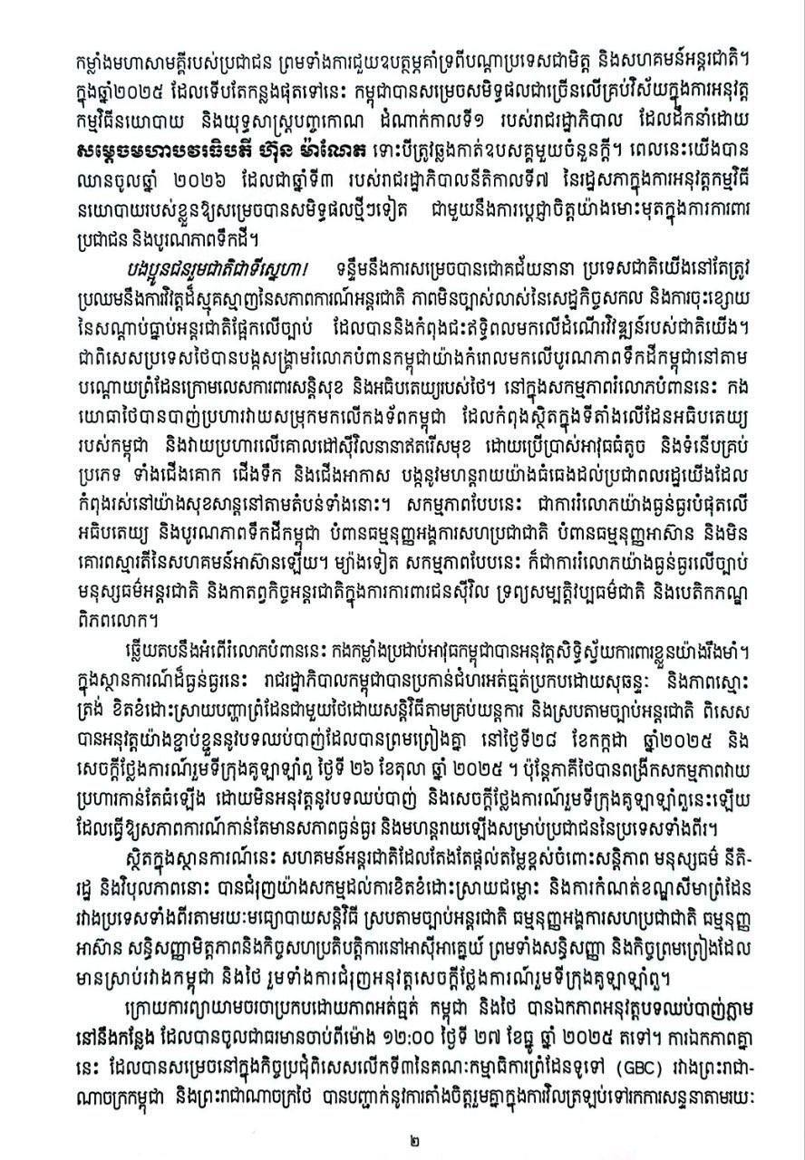ក្នុងឆ្នាំ២០២៥ ដែលទើបតែកន្លងផុតទៅនេះ កម្ពុជាបានសម្រេចសមិទ្ធផលជាច្រើនលើគ្រប់វិស័យក្នុងការអនុវត្ត កម្មវិធីនយោបាយ និងយុទ្ធសាស្ត្របញ្ចកោណ ដំណាក់កាលទី ១ របស់រាជរដ្ឋាភិបាល ដែលដឹកនាំដោយ សម្តេចមហាបវរធិបតី ហ៊ុន ម៉ាណែត ទោះបីត្រូវឆ្លងកាត់ឧបសគ្គមួយចំនួនក្តី។ ពេលនេះយើងបាន ឈានចូលឆ្នាំ ២០២៦ ដែលជាឆ្នាំទី៣ របស់រាជរដ្ឋាភិបាលនីតិកាលទី៧ នៃរដ្ឋសភាក្នុងការអនុវត្តកម្មវិធី នយោបាយរបស់ខ្លួនឱ្យសម្រេចបានសមិទ្ធផលថ្មីៗទៀត ជាមួយនឹងការប្តេជ្ញាចិត្តយ៉ាងមោះមុតក្នុងការការពារ ប្រជាជន និងបូរណភាពទឹកដី៕