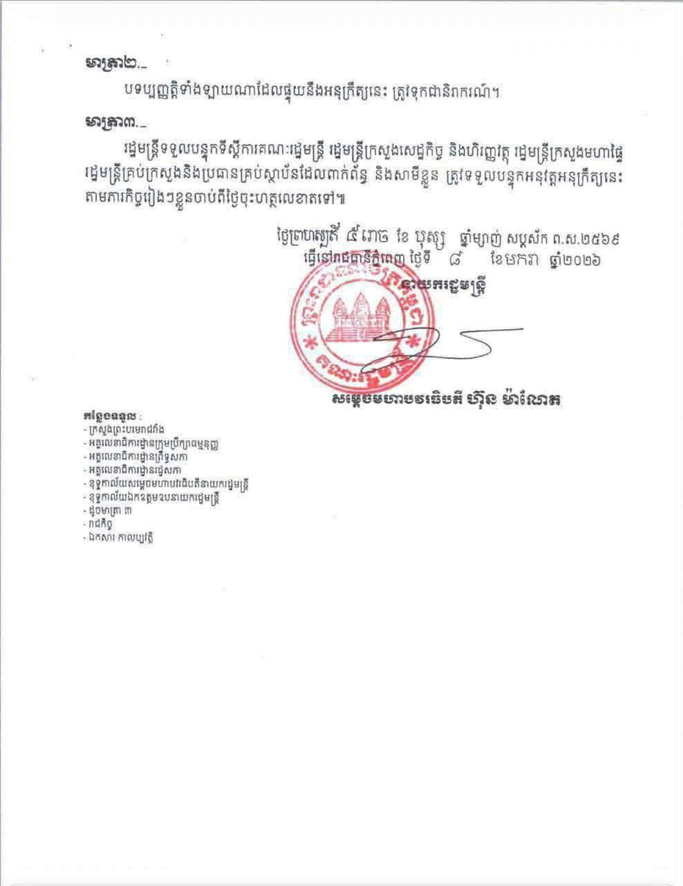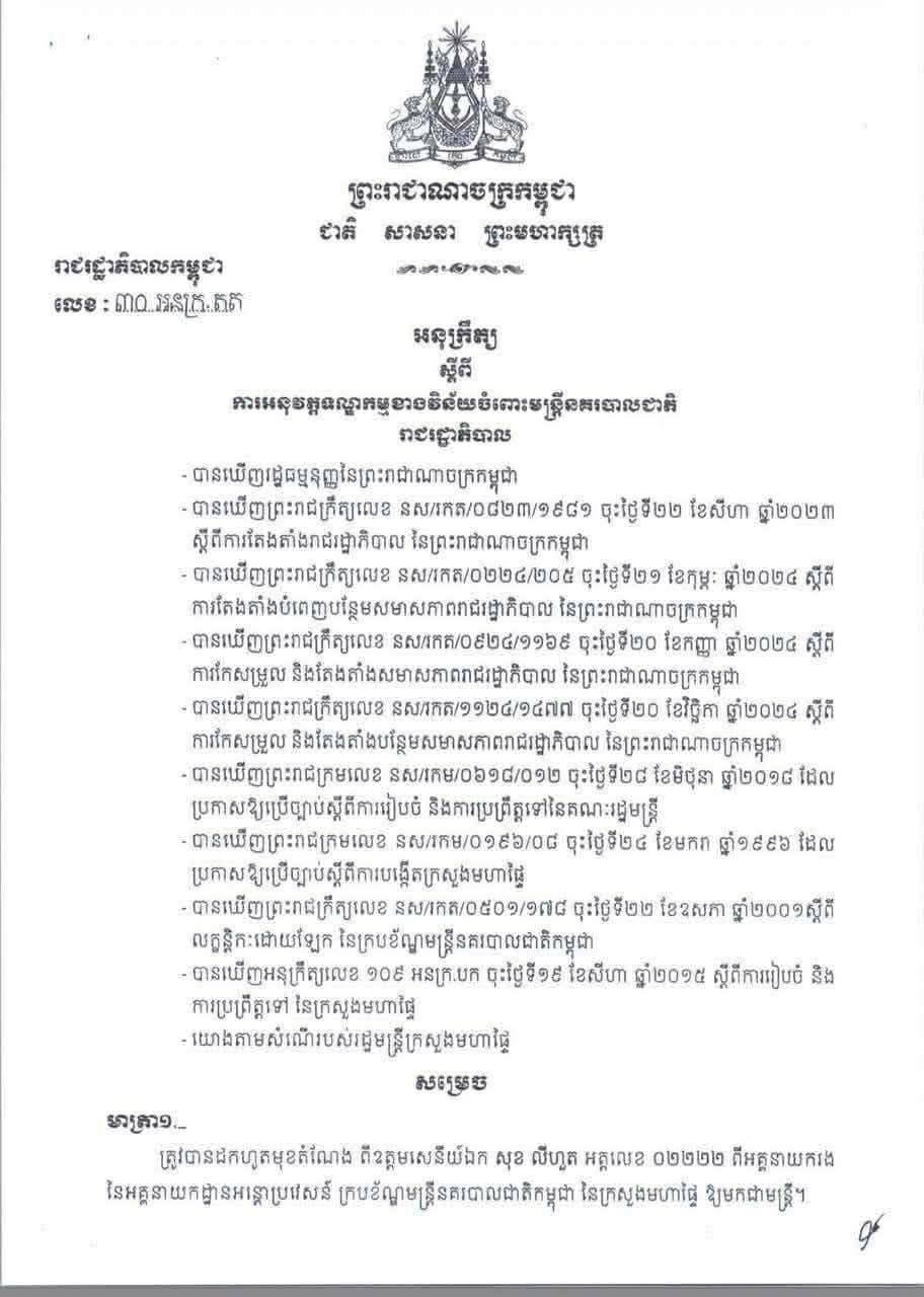 ភ្នំពេញៈ សម្ដេចបវរធិបតី ហ៊ុន ម៉ាណែត នាយករដ្ឋមន្ដ្រីនៃកម្ពុជា បានចេញអនុក្រឹត្យ សម្រេចដកហូតមុខតំណែង ឧត្តមសេនីយ៍ឯក សុខ លីហួត អគ្គលេខ ០២២២២ ពីអគ្គនាយករង នៃអគ្គនាយកដ្ឋានអន្តោប្រវេសន៍ ក្របខ័ណ្ឌមន្ត្រីនគរបាលជាតិកម្ពុជា នៃក្រសួងមហាផ្ទៃ ឱ្យមកជាមន្ត្រី។