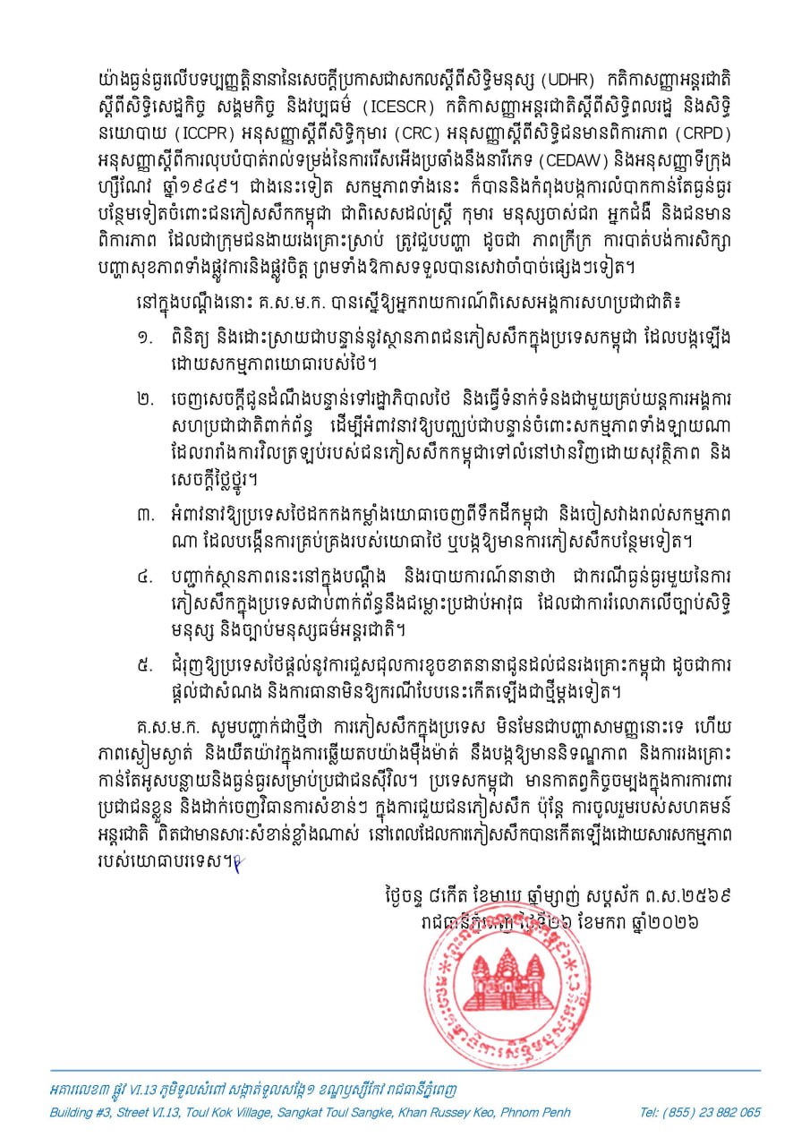តាមរយៈសេចក្តីប្រកាសព័ត៌មានរបស់គណៈកម្មាធិការសិទ្ធិមនុស្សកម្ពុជាចេញផ្សាយនៅថ្ងៃទី២៦ ខែមករា ឆ្នាំ២០២៦បានឱ្យដឹងថា គិតត្រឹមថ្ងៃទី២៥ ខែមករា ឆ្នាំ២០២៦ មានជនភៀសសឹកកម្ពុជាជាង ១១៥,០០០ នាក់ នៅតែមិនអាចត្រឡប់ទៅផ្ទះសំបែងវិញបាន ។ ប្រភពដដែលបញ្ជាក់ថា យោធាថៃបានឈ្លានពាន និងកាន់កាប់តំបន់មួយចំនួនដោយខុសច្បាប់ រួមទាំងបានកម្ទេចផ្ទះសំបែងប្រជាជនស៊ីវិល និងដាក់ពង្រាយរបាំង បន្លាលួស និងទូកុងតឺន័ររារាំងផ្លូវ ។