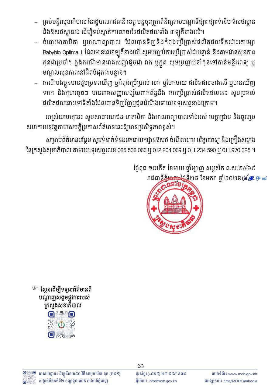 ភ្នំពេញៈ ក្រសួងសុខាភិបាល បានប្រកាសកុំឱ្យពលរដ្ឋប្រើប្រាស់នូវផលិតផលទឹកដោះគោម្សៅ Babybio Optima 1 បង្ករហានិភ័យដល់សុខភាពទារក កុមារ និងអ្នកប្រើបាស់ ខណៈដែលក្រសួងកំពុងប្រមូលត្រឡប់ពីទីផ្សារនៅទូទាំងប្រទេសកម្ពុជា ។