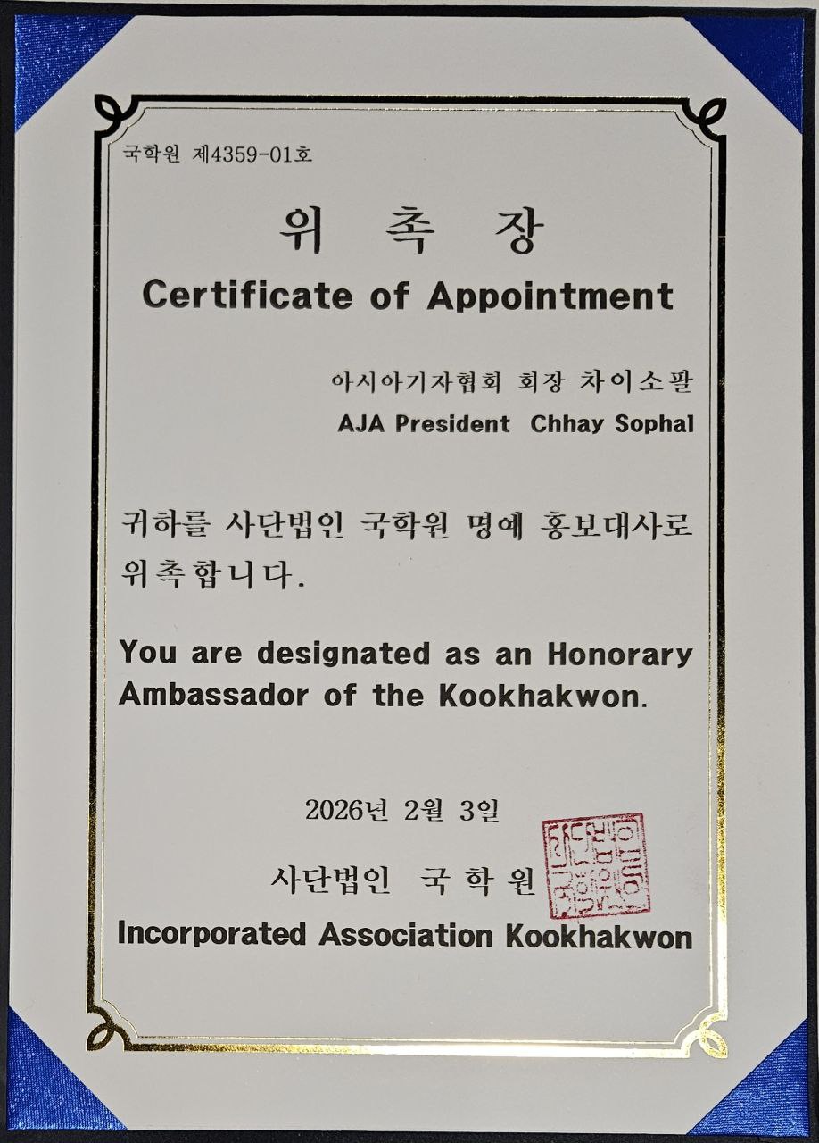 សូមបញ្ជាក់ដែរថា លោកបណ្ទិត ឆាយ សុផល ក៏ជាប្រធានសមាគមអ្នកសារព័ត៌មានអាស៊ី (Asian Journalist Association) មានមូលដ្ឋាននៅរដ្ឋធានីសេអ៊ូលផងដែរ ដែលមានសមាជិកជាអ្នកសារព័ត៌មានមកពីជិត៣០ប្រទេស នៅក្នុងទ្វីបអាស៊ី និងមជ្ឈឹមបូព៌ា។ សមាគមអ្នកសារព័ត៌មានអាស៊ីមានគេហទំព័ររបស់ខ្លួនទាំងភាសាអង់គ្លេស ភាសាកូរ៉េ និងភាសាអារ៉ាប់ ដោយសមាជិកទាំងអស់អាចផ្តល់ និងផ្សាយបន្តនូវដំណឹងរបស់សមាជិកនីមួយៗ ហើយកន្លងមក លោក ឆាយ សុផល បានសរសេរដំណឹងខ្លីៗជាច្រើនសម្រាប់គេហទំព័រនេះ ស្តីពីការលើកស្ទួយវប្បធម៌ ប្រពៃណី ទេសចរណ៍ កសិកម្ម ពាណិជ្ជកម្ម និងវិនិយោគរបស់កម្ពុជា ជាពិសេសអំពីការឈ្លានពានរបស់យោធាថៃមកលើដែនដីកម្ពុជា ព្រមទាំងការរំលោភបំពានបទឈប់បាញ់យ៉ាងធ្ងន់ធ្ងរពីសំណាក់យោធាថៃឈ្លានពាន ចាប់ពីថ្ងៃទី២៧ ខែធ្នូ រហូតមកដល់បច្ចុប្បន្ន៕