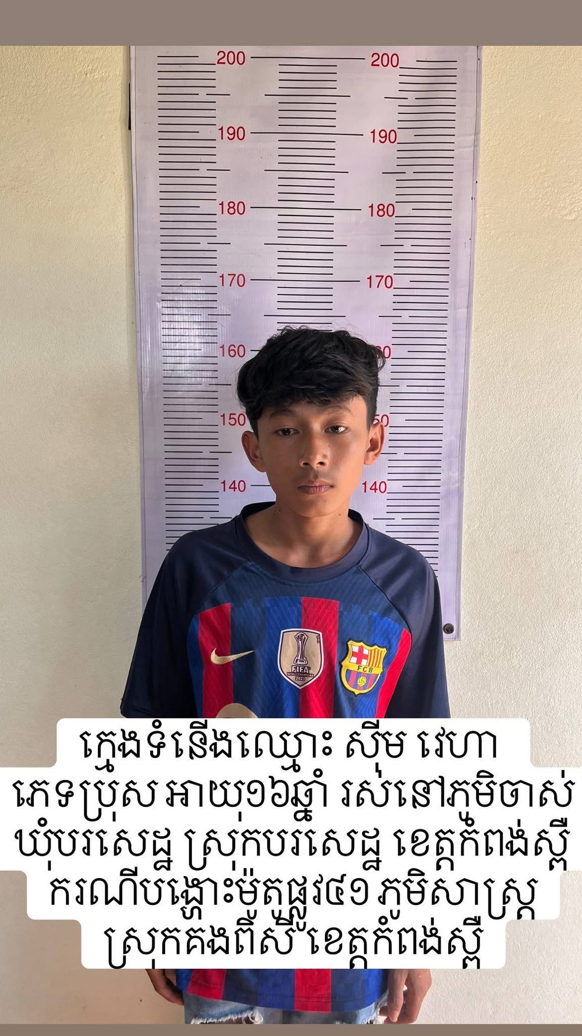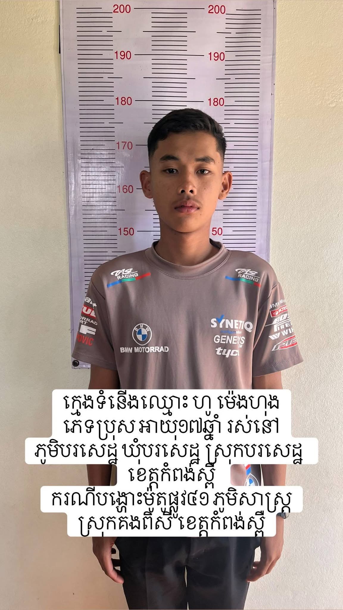 ១/ឈ្មោះ ហូ ម៉េងហុង ភេទប្រុស អាយុ ១៧ឆ្នាំ រស់នៅភូមិបឹងស្តុក ស្រុកបសេដ្ឋ ខេត្តកំពង់ស្ពឺ (អ្នកថតរូប)