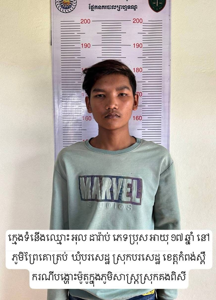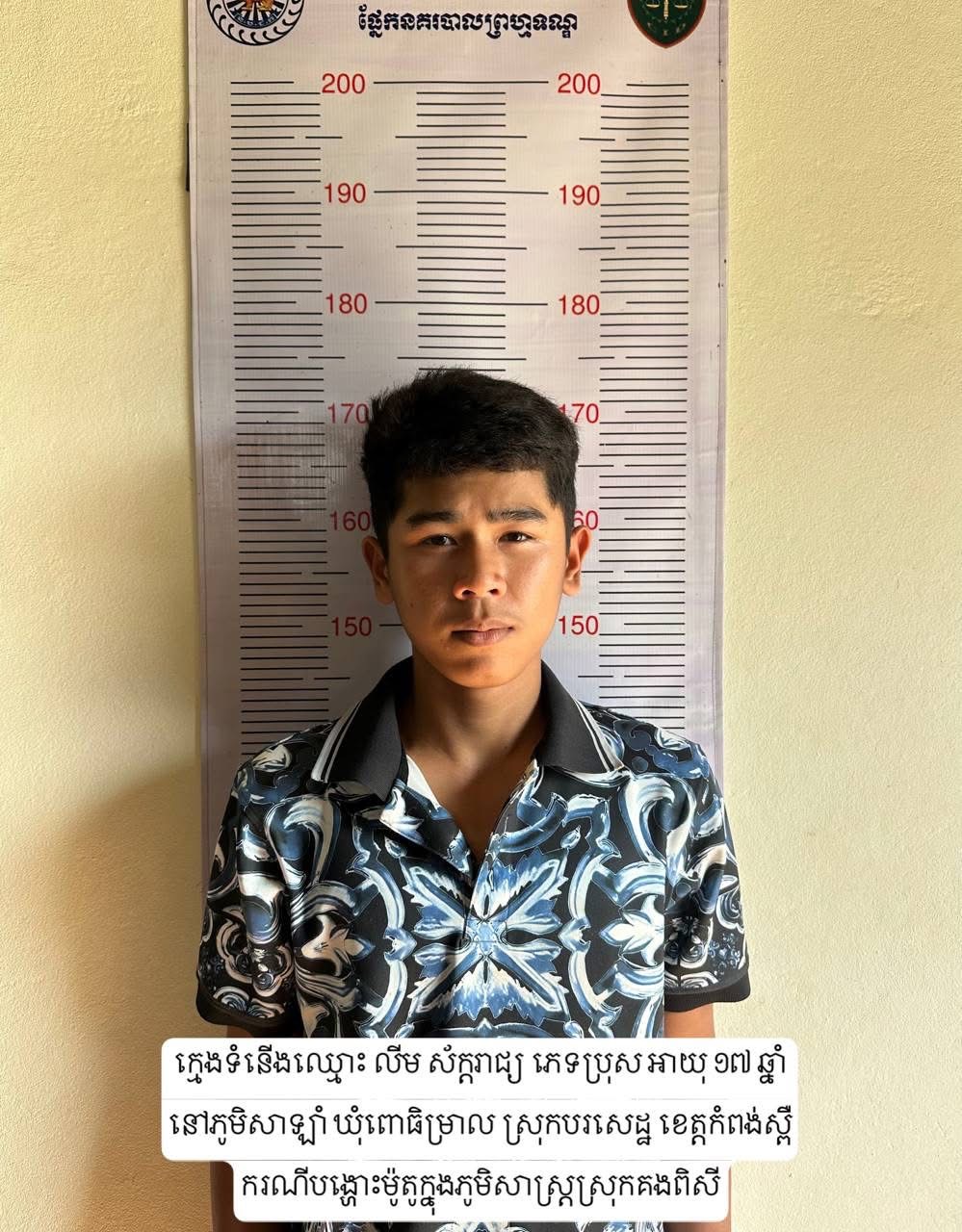 កំពង់ស្ពឺៈ នៅថ្ងៃទី០៤ ខែកុម្ភៈ ឆ្នាំ២០២៦ លោកវរសេនីយ៍ឯក យ៉ាង សុខលី អធិការនគរបាលស្រុកគងពិសី សហការជាមួយកម្លាំងនគរបាល នៃអធិការដ្ឋាននគរបាលស្រុកបរសេដ្ឋ បានធ្វើការស្រាវជ្រាវឃាត់ខ្លួនក្រុមក្មេងទំនើងដែលបង្ហោះម៉ូតូ កាលពីថ្ងៃទី០១ ខែកុម្ភៈ ឆ្នាំ២០១៦ នៅចំណុចផ្លូវជាតិលេខ៤១ ចន្លោះគីឡូម៉ែត២៦-២៧ ស្ថិតក្នុងភូមិអណ្តូងច្រុះ ឃុំស្នំក្រពើ ស្រុកគងពិសី ខេត្តកំពង់ស្ពឺ ចំនួន ៥នាក់ ក្នុងចំណោមបក្ខពួក ១០នាក់ ដែលមានឈ្មោះដូចខាងក្រោម៖