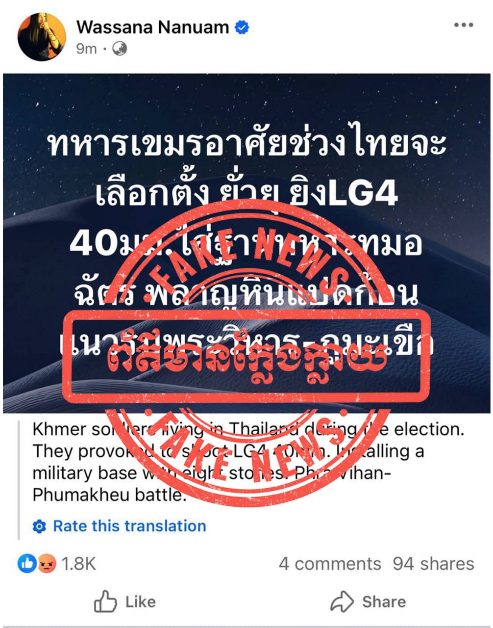 អ្នកនាំពាក្យក្រសួងការពារជាតិ សូមធ្វើការបដិសេធចោលទាំងស្រុងនូវការចុះផ្សាយរបស់បណ្តាញសារព័ត៌មានថៃខាងលើ និងសូមអះអាងថាជាព័ត៌មានប្រឌិត ក្លែងក្លាយផ្ទុយពីការពិតទាំងស្រុង ក្នុងគោលបំណងបំភាន់ដល់សាធារណមតិ និងធ្វើឱ្យស្ថានការណ៍នៅតាមបណ្តោយព្រំដែនកម្ពុជា-ថៃ មានភាពតានតឹង។