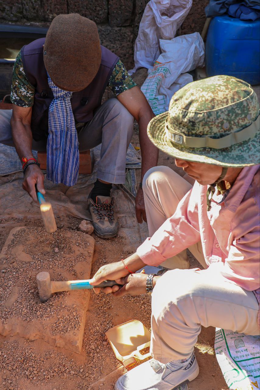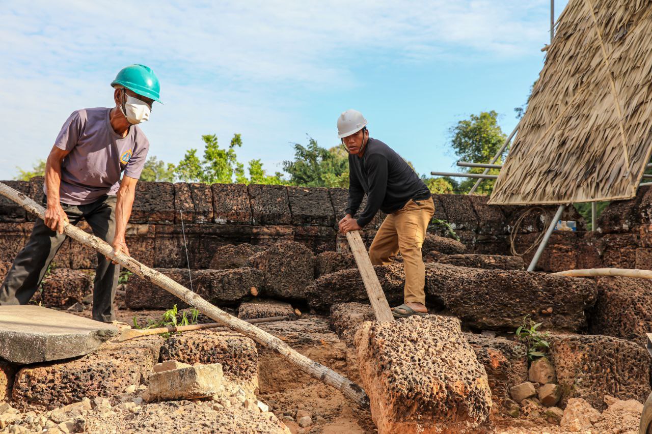 ក្នុងនោះ ក្រុមការងារផ្តោតសំខាន់ទៅលើការជួសជុលគ្រឹះ និងជញ្ជាំងថ្មបាយក្រៀម ដែលព័ទ្ធជុំវិញជារចនាសម្ពន្ធសម្រាប់ទ្រទ្រង់ដល់តួប៉មឥដ្ឋផ្នែកខាងលើ ដោយធ្វើការសម្អាតយកកំណកដីចេញពីតាមចន្លោះថ្នេរថ្ម និងកន្លែងប្រេះ រួចបិតបាយអឡើងវិញ ដើម្បីធានាមិនឱ្យទឹកជ្រាបចូល។