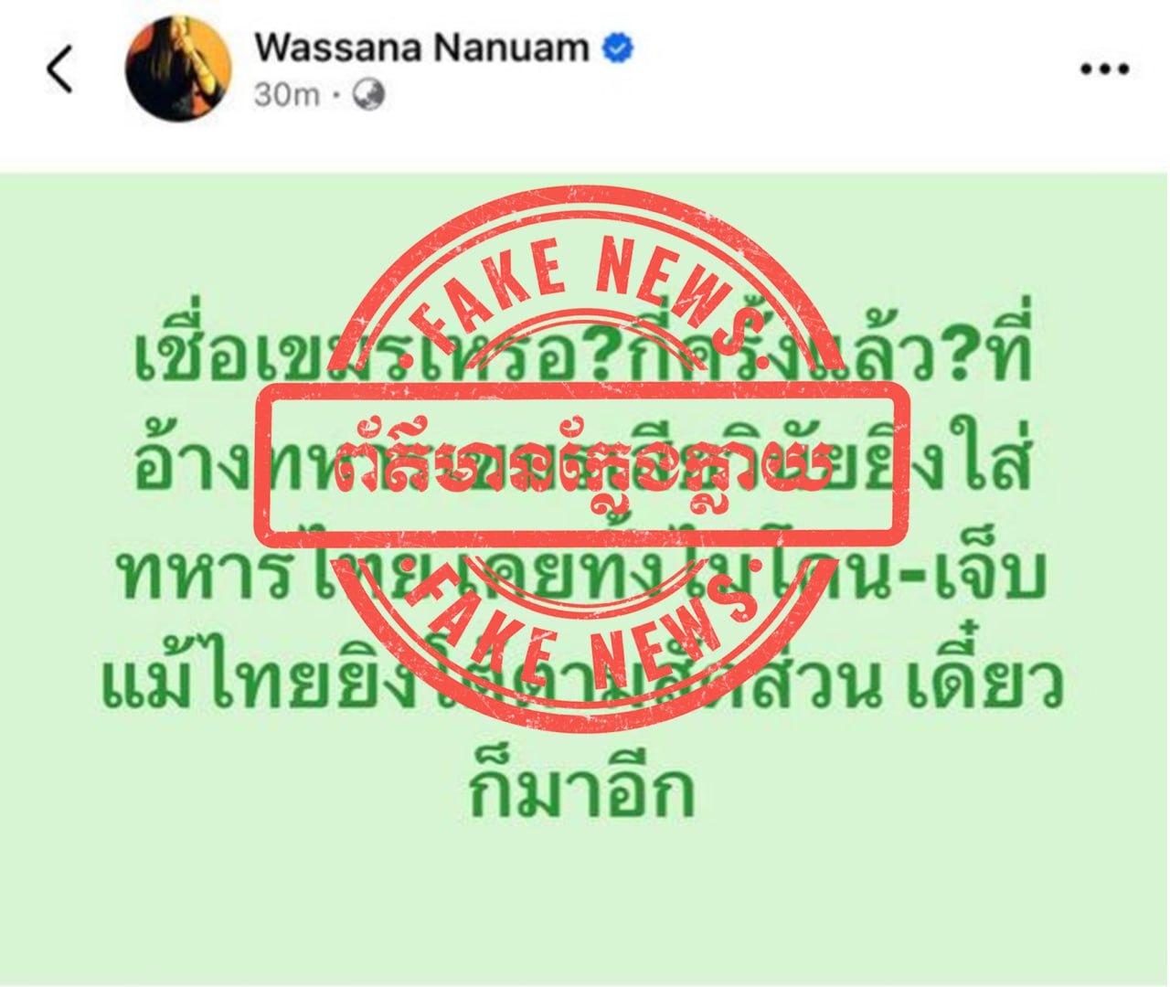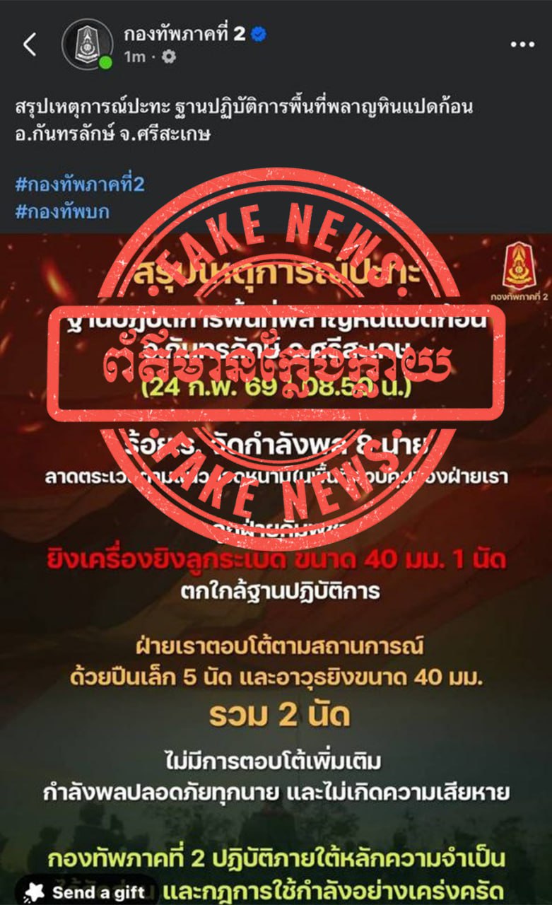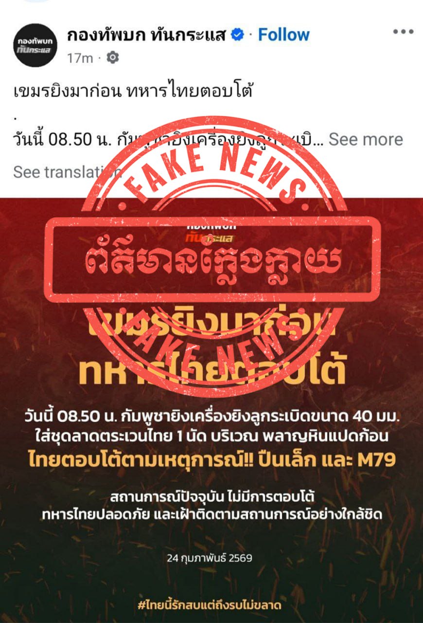 ជាមួយគ្នានេះ ក្រសួងការពារជាតិ សូមអំពាវនាវដល់សាធារណជន និងអ្នកសារព័ត៌មានទាំងអស់ សូមកុំចែករំលែកនូវព័ត៌មានក្លែងក្លាយដែលបានផ្សព្វផ្សាយដោយសារព័ត៌មានថៃខាងលើ ដោយតាមដាន និងទទួលយកតែព័ត៌មានដែលមានប្រភពច្បាស់លាស់ ត្រឹមត្រូវ និងជឿទុកចិត្តបាន ជាពិសេសការផ្តល់ជូនព័ត៌មានដោយរាជរដ្ឋាភិបាល ទំព័រផ្លូវការរបស់ថ្នាក់ដឹកនាំ ក្រសួង និងអង្គភាពពាក់ព័ន្ធរបស់យើង៕