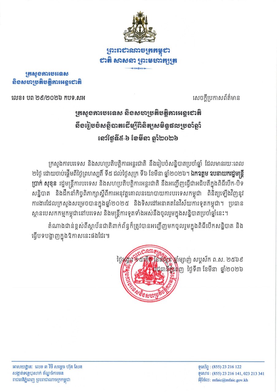 ភ្នំពេញៈ ក្រសួងការបរទេស និងសហប្រតិបត្តិការអន្តរជាតិ នឹងរៀបចំសន្និបាតដើម្បីពិនិត្យសមិទ្ធផលប្រចាំឆ្នាំ នៅថ្ងៃទី៥-៦ ខែមីនា ឆ្នាំ២០២៦។