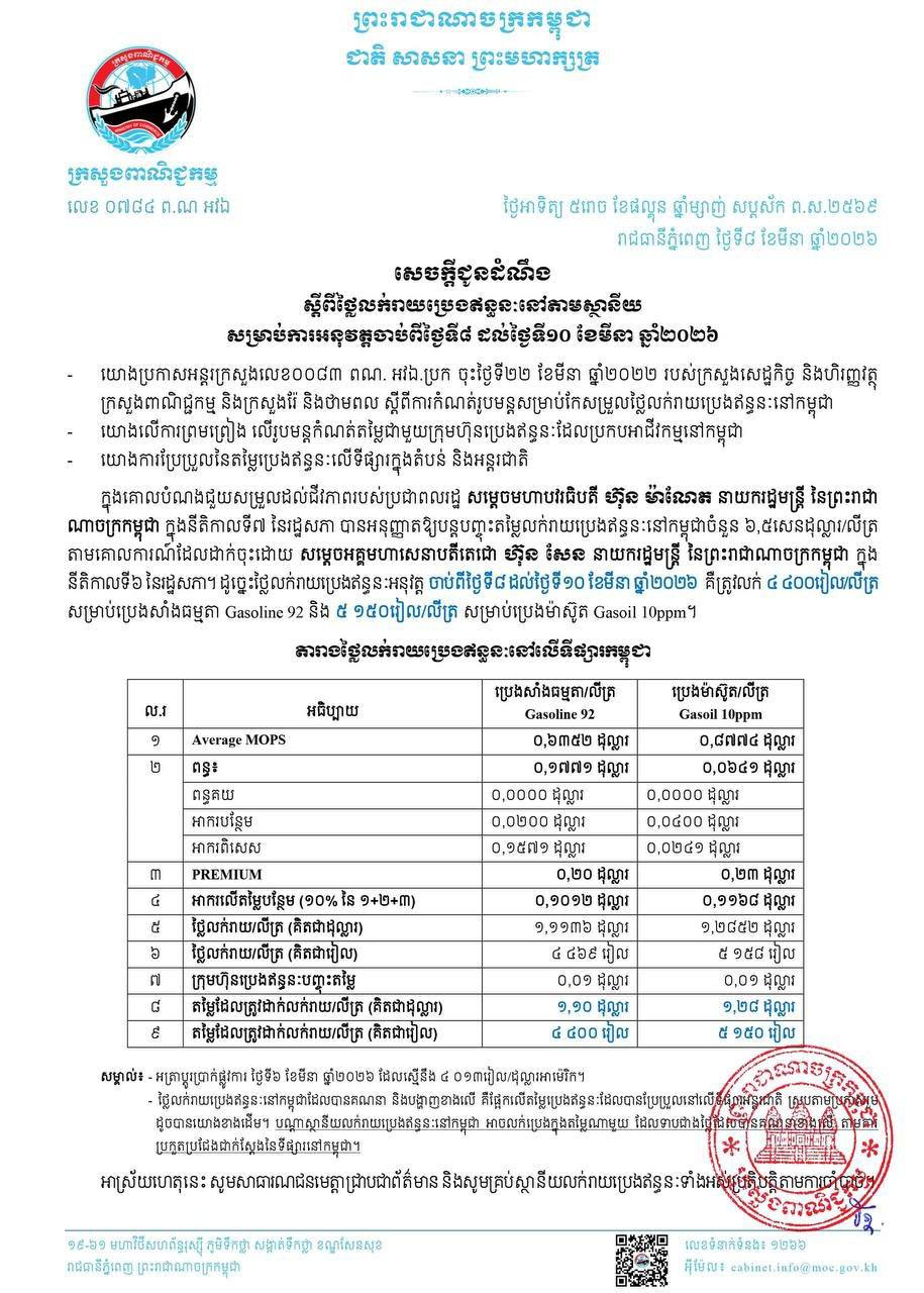 ភ្នំពេញៈ ក្រសួងពាណិជ្ជកម្ម ចេញប្រកាសអំពីតម្លៃប្រេងកើនឡើង សម្រាប់ថ្ងៃទី៨ ដល់ទី១០ ខែមីនា ឆ្នាំ២០២៦ - សាំង = ៤,៤០០រៀល - ម៉ាស៊ូត = ៥,១៥០រៀល។